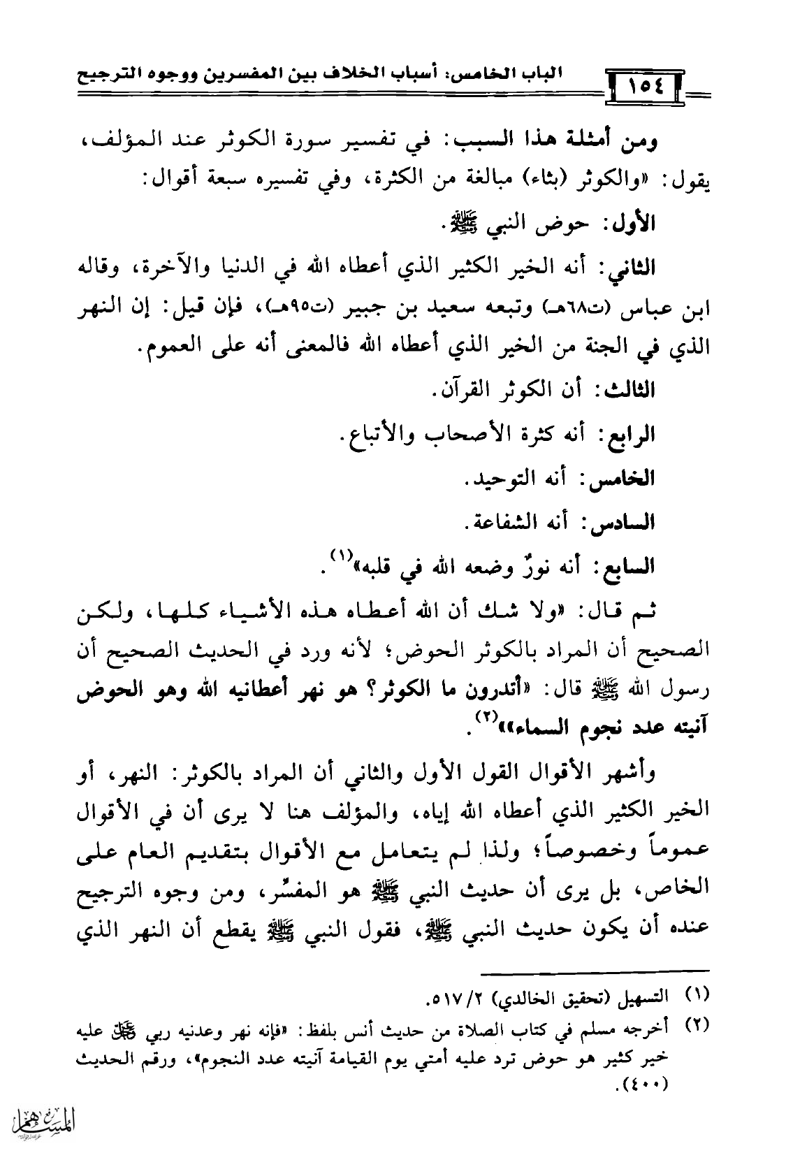 وأشهر الأقوال القول الأول والثاني أن المراد بالكوثر: النهر، أو الخير الكثير الذي أعطاه الله إياه، والمؤلف هنا لا يرى أن في الأقوال عموماً وخصوصاً؛ ولذا لم يتعامل مع الأقوال بتقديم العام على الخاص، بل يرى أن حديث النبي صلّى الله عليه وسلّم هو المفسِّر، ومن وجوه الترجيح عنده أن يكون حديث النبي صلّى الله عليه وسلّم، فقول النبي صلّى الله عليه وسلّم يقطع أن النهر الذي