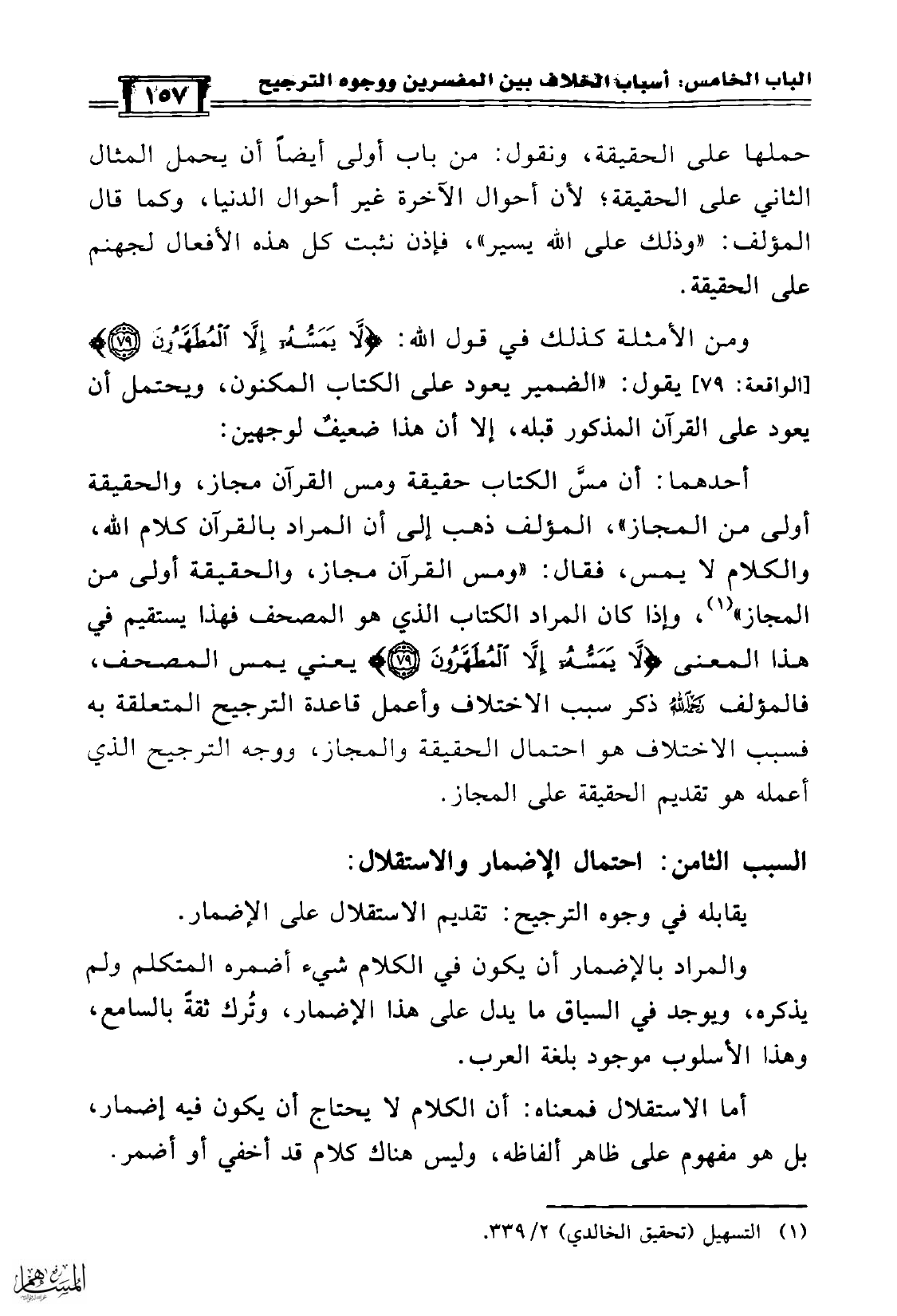 أحدهما: أن مسَّ الكتاب حقيقة ومس القرآن مجاز، والحقيقة أولى من المجاز»، المؤلف ذهب إلى أن المراد بالقرآن كلام الله، والكلام لا يمس، فقال: «ومس القرآن مجاز، والحقيقة أولى من المجاز» (¬1)، وإذا كان المراد الكتاب الذي هو المصحف فهذا يستقيم في هذا المعنى {لاَ يَمَسُّهُ إِلاَّ الْمُطَهَّرُونَ} يعني يمس المصحف، فالمؤلف رحمه الله ذكر سبب الاختلاف وأعمل قاعدة الترجيح المتعلقة به فسبب الاختلاف هو احتمال الحقيقة والمجاز، ووجه الترجيح الذي أعمله هو تقديم الحقيقة على المجاز.