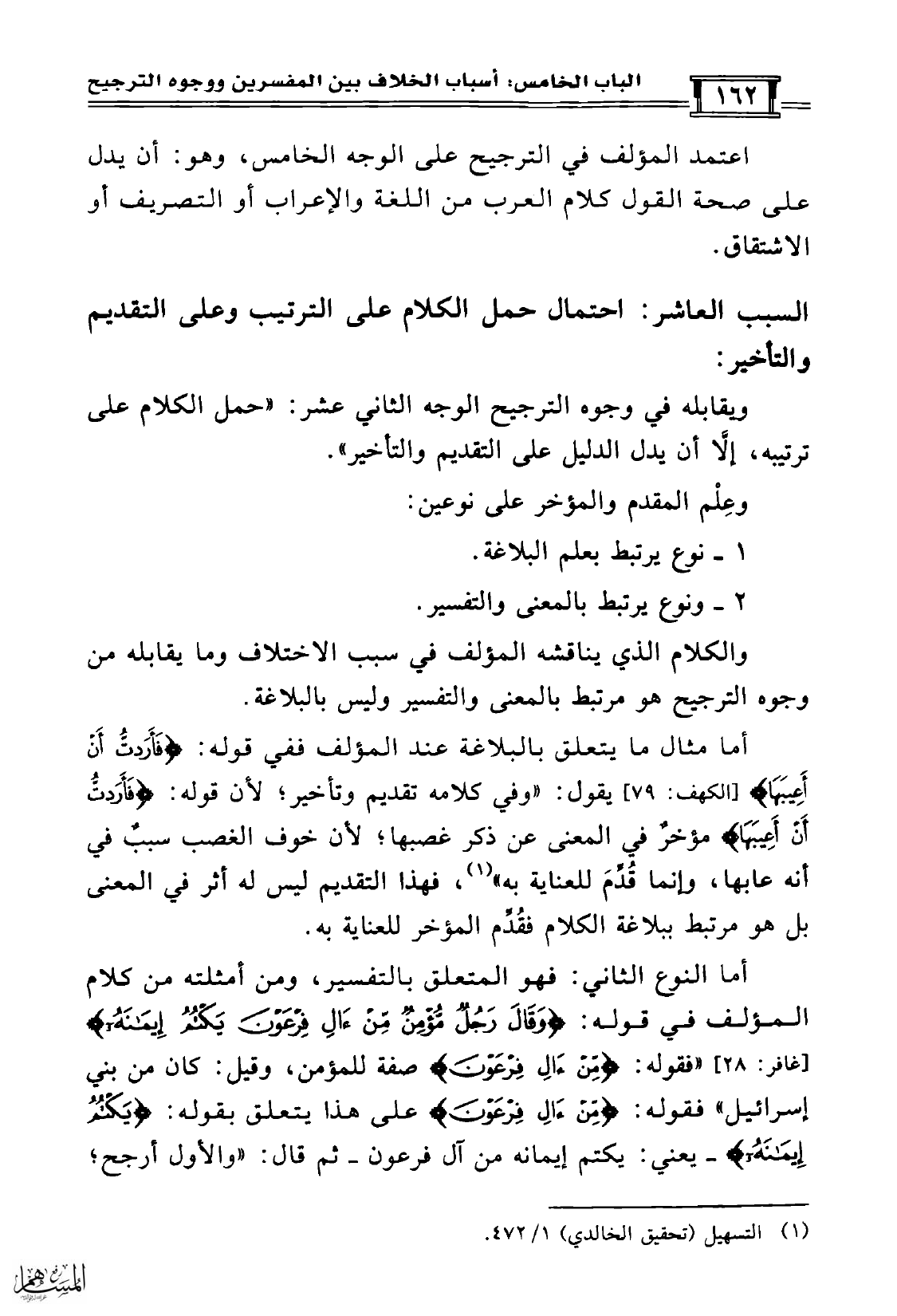 والكلام الذي يناقشه المؤلف في سبب الاختلاف وما يقابله من وجوه الترجيح هو مرتبط بالمعنى والتفسير وليس بالبلاغة.