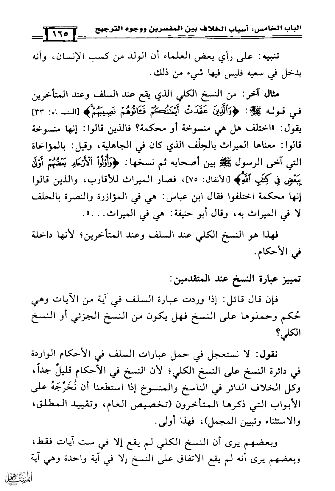 مثال آخر: من النسخ الكلي الذي يقع عند السلف وعند المتأخرين في قوله سبحانه وتعالى: {وَالَّذِينَ عَقَدَتْ أَيْمَانُكُمْ فَآتُوهُمْ نَصِيبَهُمْ} [النساء: 33] يقول: «اختلف هل هي منسوخة أو محكمة؟ فالذين قالوا: إنها منسوخة قالوا: معناها الميراث بالحِلْف الذي كان في الجاهلية، وقيل: بالمؤاخاة التي آخى الرسول صلّى الله عليه وسلّم بين أصحابه ثم نسخها: {وَأُولُو الأَرْحَامِ بَعْضُهُمْ أَوْلَى بِبَعْضٍ فِي كِتَابِ اللَّهِ} [الأنفال: 75]، فصار الميراث للأقارب، والذين قالوا إنها محكمة اختلفوا فقال ابن عباس: هي في المؤازرة والنصرة بالحلف لا في الميراث به، وقال أبو حنيفة: هي في الميراث ...».