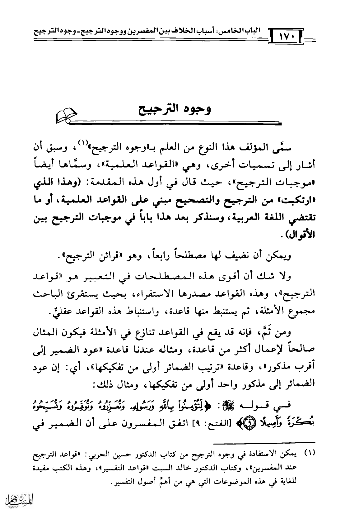 (¬1) يمكن الاستفادة في وجوه الترجيح من كتاب الدكتور حسين الحربي: «قواعد الترجيح عند المفسرين»، وكتاب الدكتور خالد السبت «قواعد التفسير»، وهذه الكتب مفيدة للغاية في هذه الموضوعات التي هي من أهمِّ أصول التفسير.