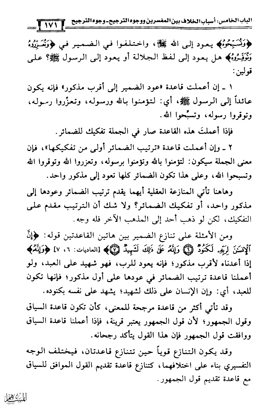 2 - وإن أعملت قاعدة «ترتيب الضمائر أولى من تفكيكها»، فإن معنى الجملة سيكون: لتؤمنوا بالله وتؤمنوا برسوله، وتعزروا الله وتوقروا الله وتسبحوا الله، وعلى هذا تكون الضمائر كلها تعود إلى مذكور واحد.