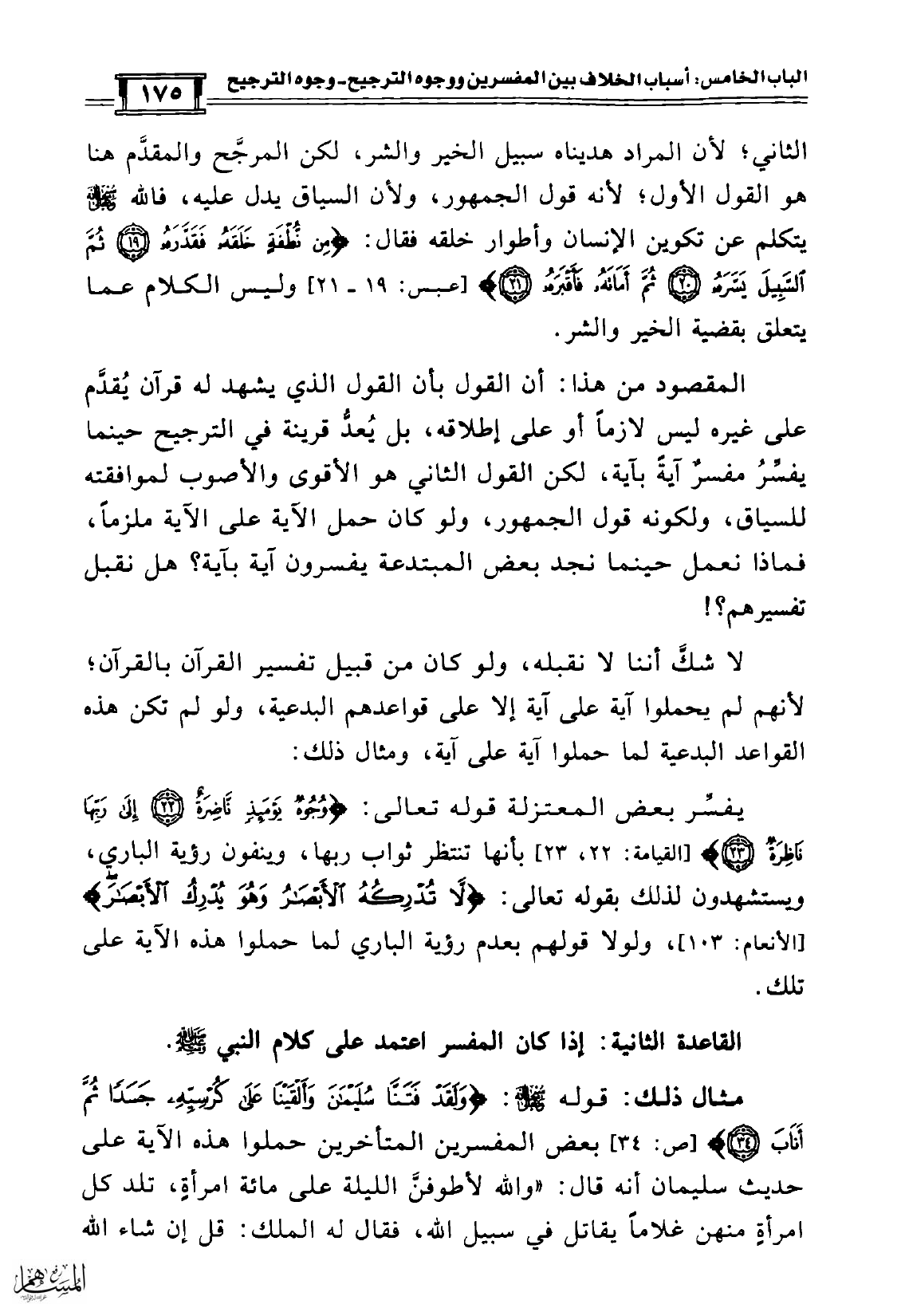 المقصود من هذا: أن القول بأن القول الذي يشهد له قرآن يُقدَّم على غيره ليس لازماً أو على إطلاقه، بل يُعدُّ قرينة في الترجيح حينما يفسِّرُ مفسرٌ آيةً بآية، لكن القول الثاني هو الأقوى والأصوب لموافقته للسياق، ولكونه قول الجمهور، ولو كان حمل الآية على الآية ملزماً، فماذا نعمل حينما نجد بعض المبتدعة يفسرون آية بآية؟ هل نقبل تفسيرهم؟!