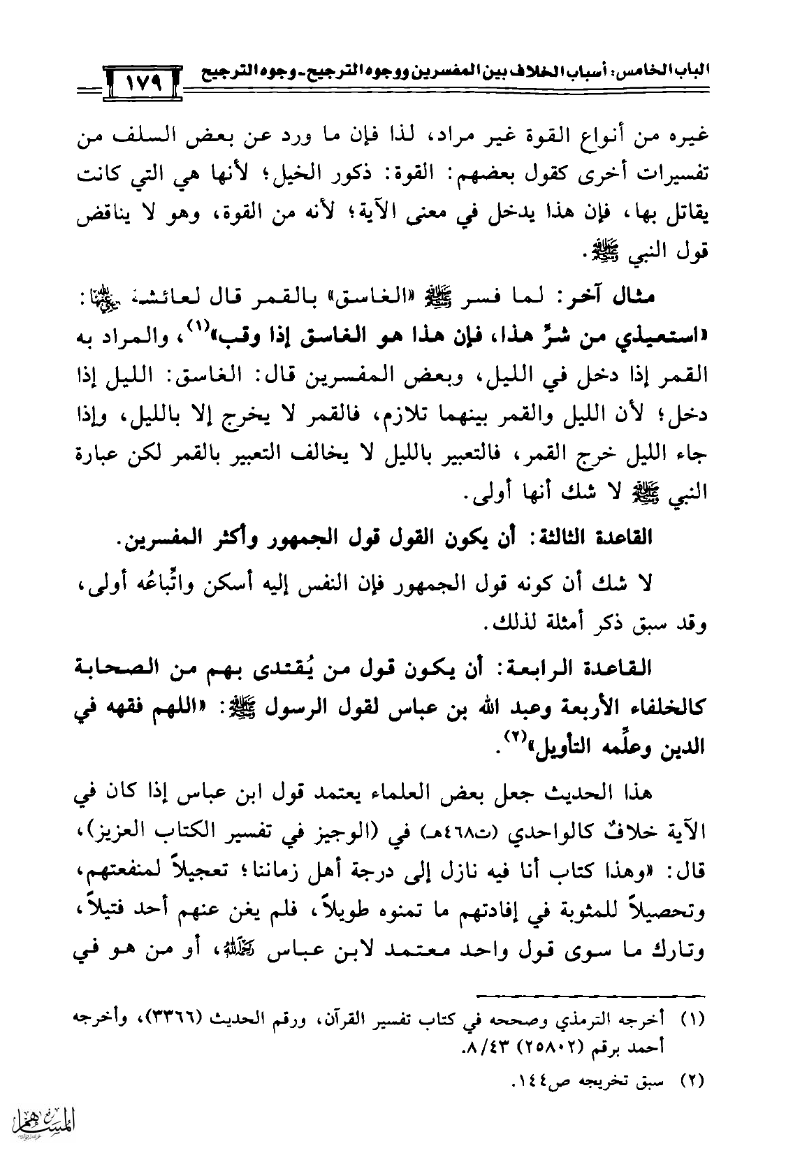 القاعدة الرابعة: أن يكون قول من يُقتدى بهم من الصحابة كالخلفاء الأربعة وعبد الله بن عباس لقول الرسول صلّى الله عليه وسلّم: «اللهم فقهه في الدين وعلِّمه التأويل» (¬2).