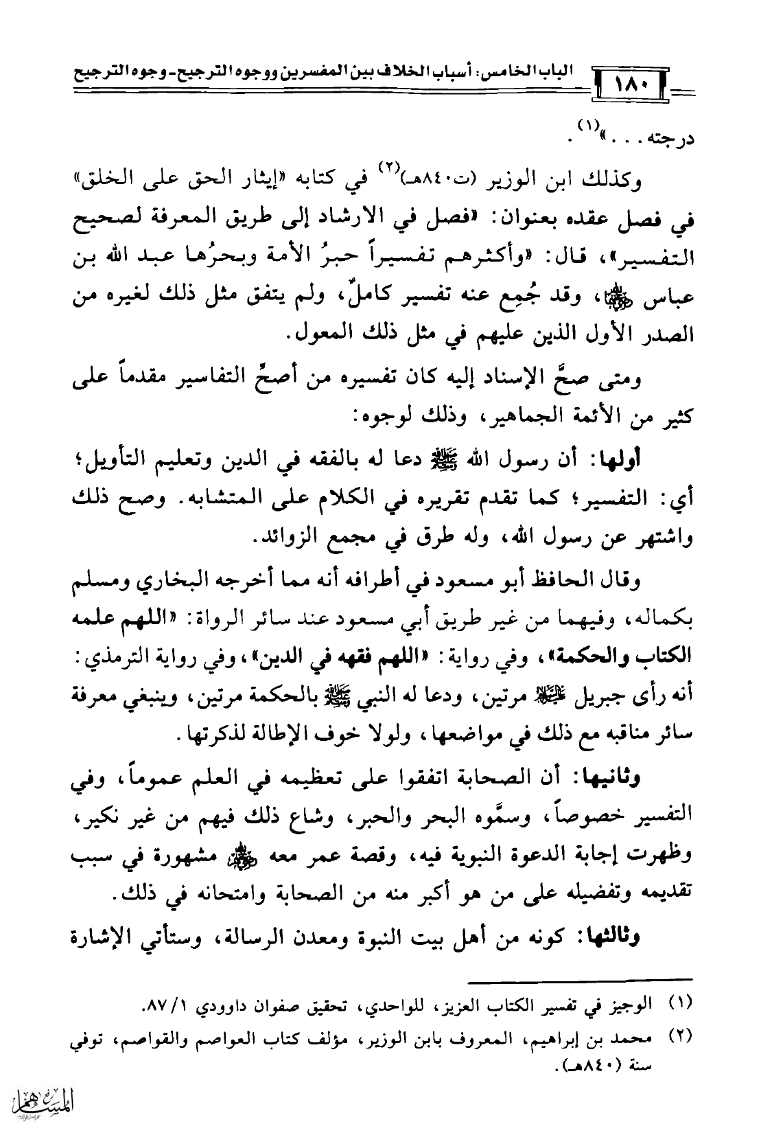 وكذلك ابن الوزير (ت840هـ) (¬2) في كتابه «إيثار الحق على الخلق» في فصل عقده بعنوان: «فصل في الارشاد إلى طريق المعرفة لصحيح التفسير»، قال: «وأكثرهم تفسيراً حبرُ الأمة وبحرُها عبد الله بن عباس رضي الله عنهما، وقد جُمِع عنه تفسير كاملٌ، ولم يتفق مثل ذلك لغيره من الصدر الأول الذين عليهم في مثل ذلك المعول.