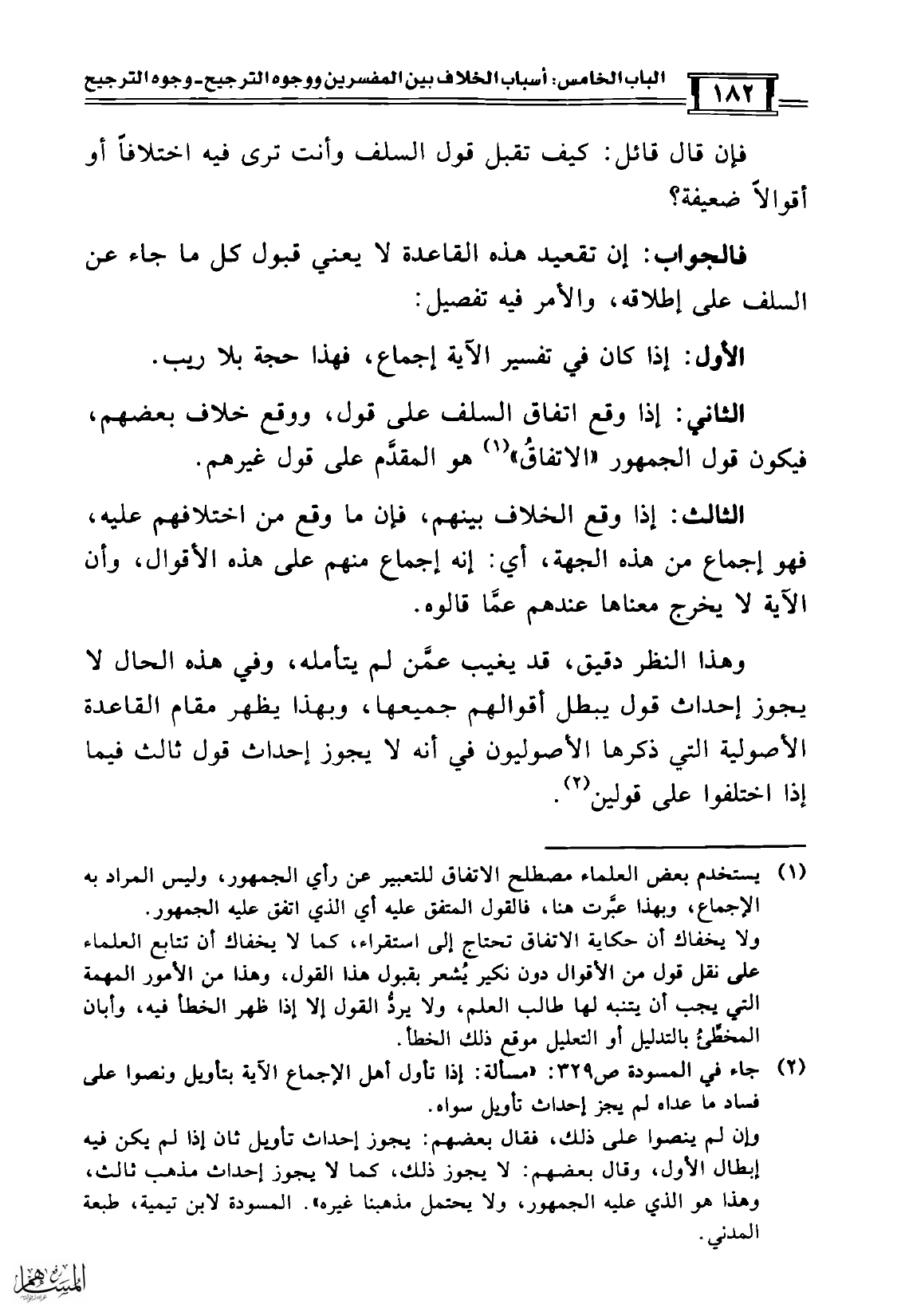 (¬1) يستخدم بعض العلماء مصطلح الاتفاق للتعبير عن رأي الجمهور، وليس المراد به الإجماع، وبهذا عبَّرت هنا، فالقول المتفق عليه أي الذي اتفق عليه الجمهور.