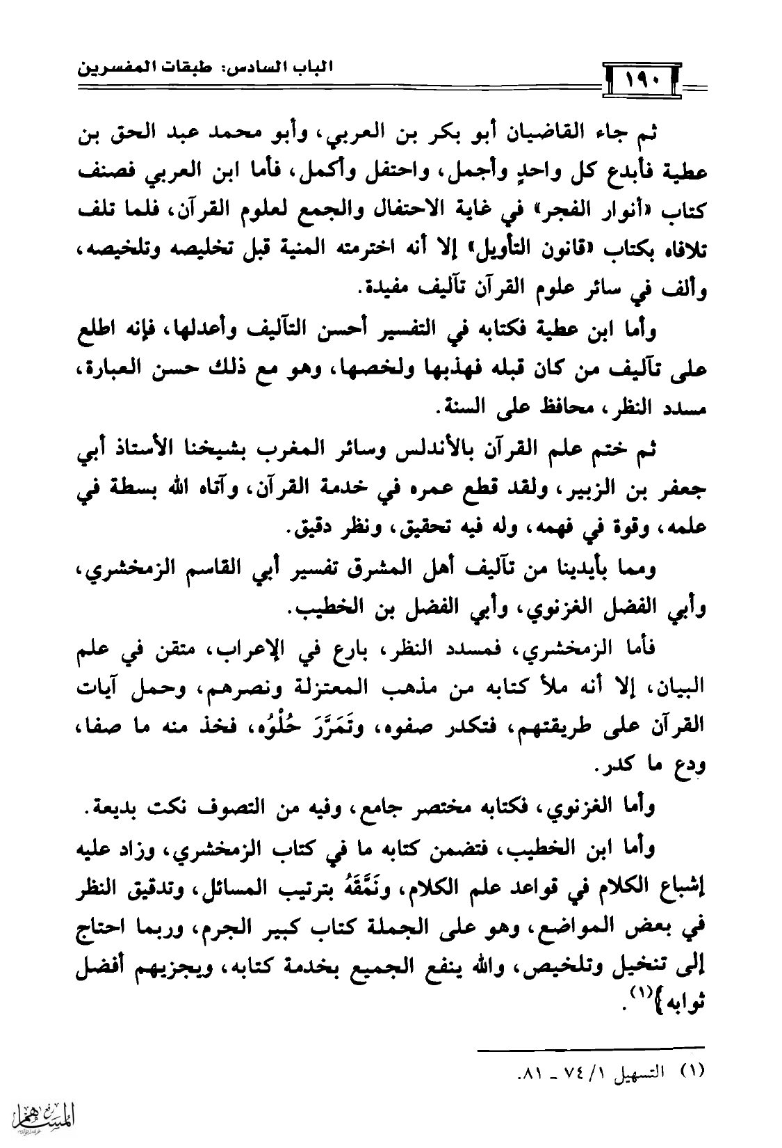 ثم جاء القاضيان أبو بكر بن العربي، وأبو محمد عبد الحق بن عطية فأبدع كل واحدٍ وأجمل، واحتفل وأكمل، فأما ابن العربي فصنف كتاب «أنوار الفجر» في غاية الاحتفال والجمع لعلوم القرآن، فلما تلف تلافاه بكتاب «قانون التأويل» إلا أنه اخترمته المنية قبل تخليصه وتلخيصه، وألف في سائر علوم القرآن تآليف مفيدة.