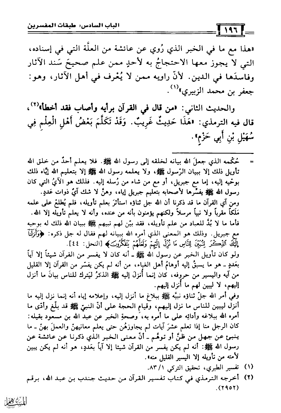 وفي أمر الله جلّ ثناؤه نبيَّه صلّى الله عليه وسلّم ببلاغ ما أنزل إليه، وإعلامه إياه أنه إنما نزل إليه ما أنزل ليبين للناس ما نزل إليهم، وقيامِ الحجة على أنّ النبيّ صلّى الله عليه وسلّم قد بلّغ وأدّى ما أمره الله ببلاغه وأدائِه على ما أمره به، وصحةِ الخبر عن عبد الله بن مسعود بقيله: كان الرجل منا إذا تعلم عشرَ آيات لم يجاوزهُن حتى يعلم معانيهنّ والعملَ بهنّ ـ ما ينبئ عن جهل من ظنَّ أو توهَّم ـ أنّ معنى الخبر الذي ذكرنا عن عائشة عن رسول الله صلّى الله عليه وسلّم: أنه لم يكن يفسر من القرآن شيئا إلا آياً بعَددٍ، هو أنه لم يكن يبين لأمته من تأويله إلا اليسير القليل منه».