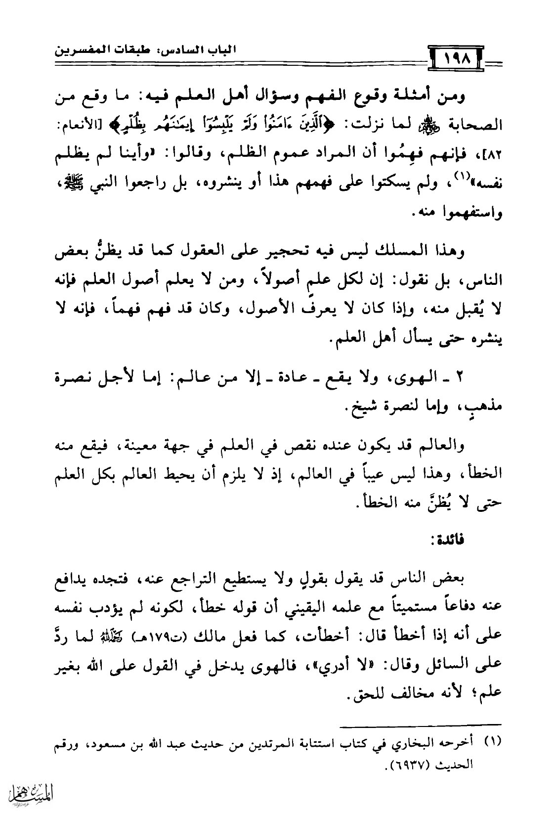 وهذا المسلك ليس فيه تحجير على العقول كما قد يظنُّ بعض الناس، بل نقول: إن لكل علمٍ أصولاً، ومن لا يعلم أصول العلم فإنه لا يُقبل منه، وإذا كان لا يعرف الأصول، وكان قد فهم فهماً، فإنه لا ينشره حتى يسأل أهل العلم.