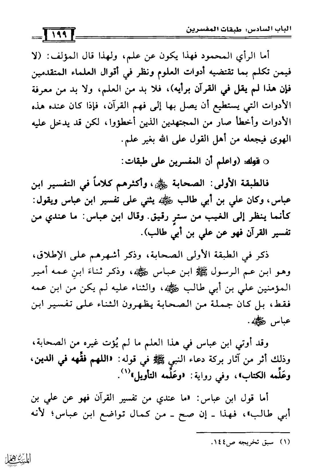 ذكر في الطبقة الأولى الصحابة، وذكر أشهرهم على الإطلاق، وهو ابن عم الرسول صلّى الله عليه وسلّم ابن عباس رضي الله عنه، وذكر ثناءَ ابنِ عمه أمير المؤمنين علي بن أبي طالب رضي الله عنه، والثناء عليه لم يكن من ابن عمه فقط، بل كان جملة من الصحابة يظهرون الثناء على تفسير ابن عباس رضي الله عنه.