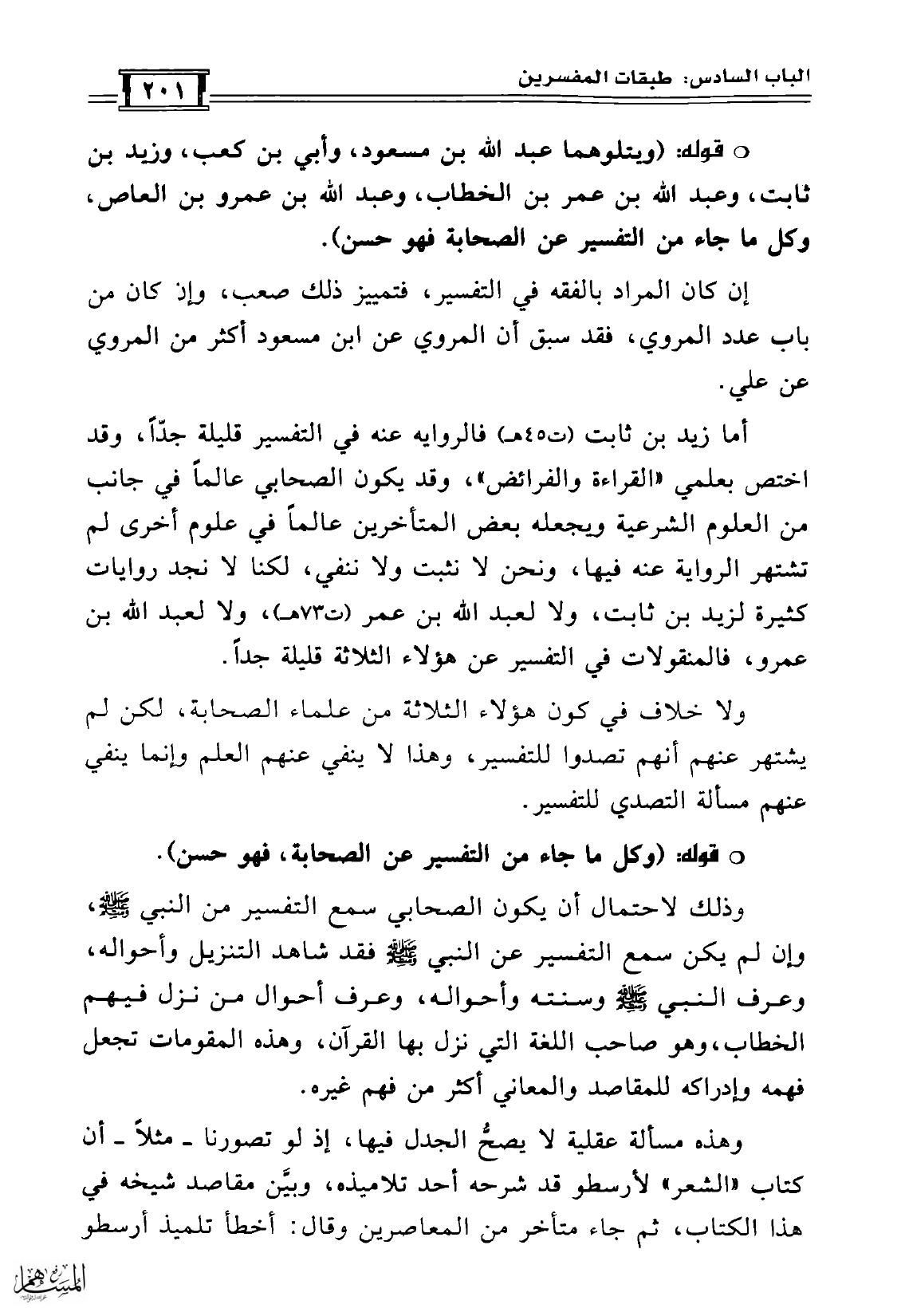 قوله: (ويتلوهما عبد الله بن مسعود، وأبي بن كعب، وزيد بن ثابت، وعبد الله بن عمر بن الخطاب، وعبد الله بن عمرو بن العاص، وكل ما جاء من التفسير عن الصحابة فهو حسن).