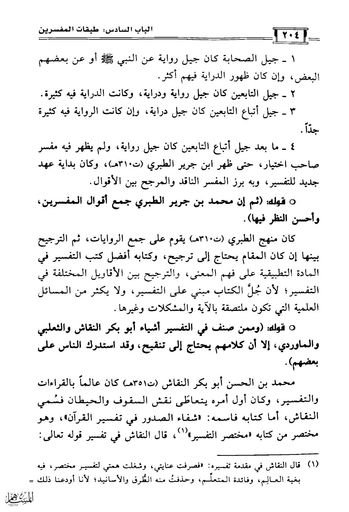 4 - ما بعد جيل أتباع التابعين كان جيل رواية، ولم يظهر فيه مفسر صاحب اختيار، حتى ظهر ابن جرير الطبري (ت310هـ)، وكان بداية عهد جديد للتفسير، وبه برز المفسر الناقد والمرجح بين الأقوال.