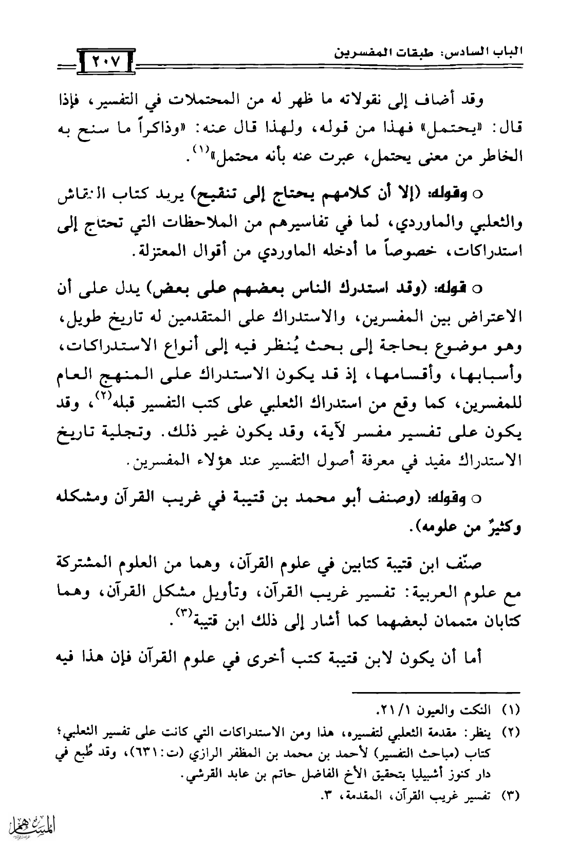 (¬2) ينظر: مقدمة الثعلبي لتفسيره، هذا ومن الاستدراكات التي كانت على تفسير الثعلبي؛ كتاب (مباحث التفسير) لأحمد بن محمد بن المظفر الرازي (ت:631)، وقد طُبع في دار كنوز أشبيليا بتحقيق الأخ الفاضل حاتم بن عابد القرشي.