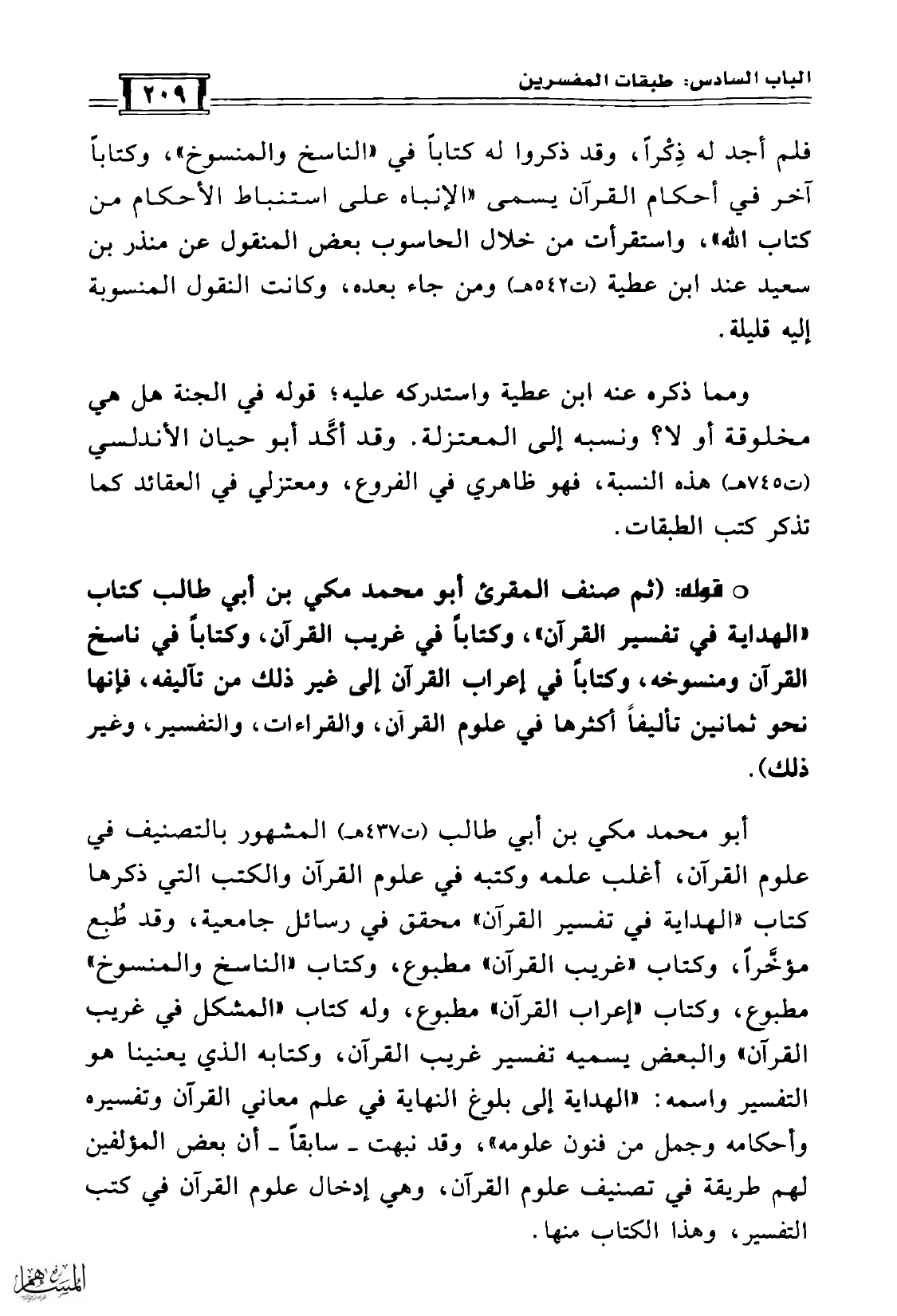 أبو محمد مكي بن أبي طالب (ت437هـ) المشهور بالتصنيف في علوم القرآن، أغلب علمه وكتبه في علوم القرآن والكتب التي ذكرها كتاب «الهداية في تفسير القرآن» محقق في رسائل جامعية، وقد طُبِع مؤخَّراً، وكتاب «غريب القرآن» مطبوع، وكتاب «الناسخ والمنسوخ» مطبوع، وكتاب «إعراب القرآن» مطبوع، وله كتاب «المشكل في غريب القرآن» والبعض يسميه تفسير غريب القرآن، وكتابه الذي يعنينا هو التفسير واسمه: «الهداية إلى بلوغ النهاية في علم معاني القرآن وتفسيره وأحكامه وجمل من فنون علومه»، وقد نبهت ـ سابقاً ـ أن بعض المؤلفين لهم طريقة في تصنيف علوم القرآن، وهي إدخال علوم القرآن في كتب التفسير، وهذا الكتاب منها.