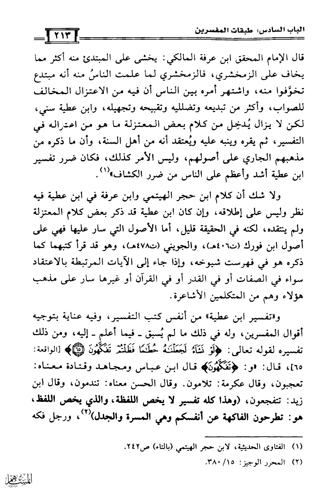 ولا شك أن كلام ابن حجر الهيتمي وابن عرفة في ابن عطية فيه نظر وليس على إطلاقه، وإن كان ابن عطية قد ذكر بعض كلام المعتزلة ولم ينتقده، لكنه في الحقيقة قليل، أما الأصول التي سار عليها فهي على أصول ابن فورك (ت406هـ)، والجويني (ت478هـ)، وهو قد قرأ كتبهما كما ذكره هو في فهرست شيوخه، وإذا جاء إلى الآيات المرتبطة بالاعتقاد سواء في الصفات أو في القدر أو في القرآن أو غيرها سار على مذهب هؤلاء وهم من المتكلمين الأشاعرة.