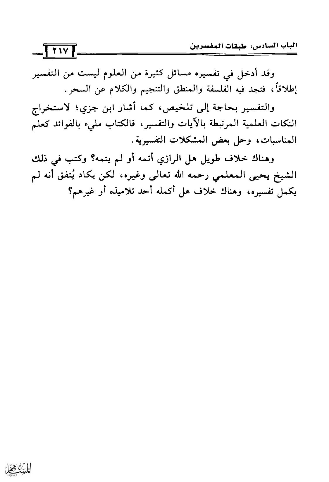 وهناك خلاف طويل هل الرازي أتمه أو لم يتمه؟ وكتب في ذلك الشيخ يحيى المعلمي رحمه الله تعالى وغيره، لكن يكاد يُتفق أنه لم يكمل تفسيره، وهناك خلاف هل أكمله أحد تلاميذه أو غيرهم؟