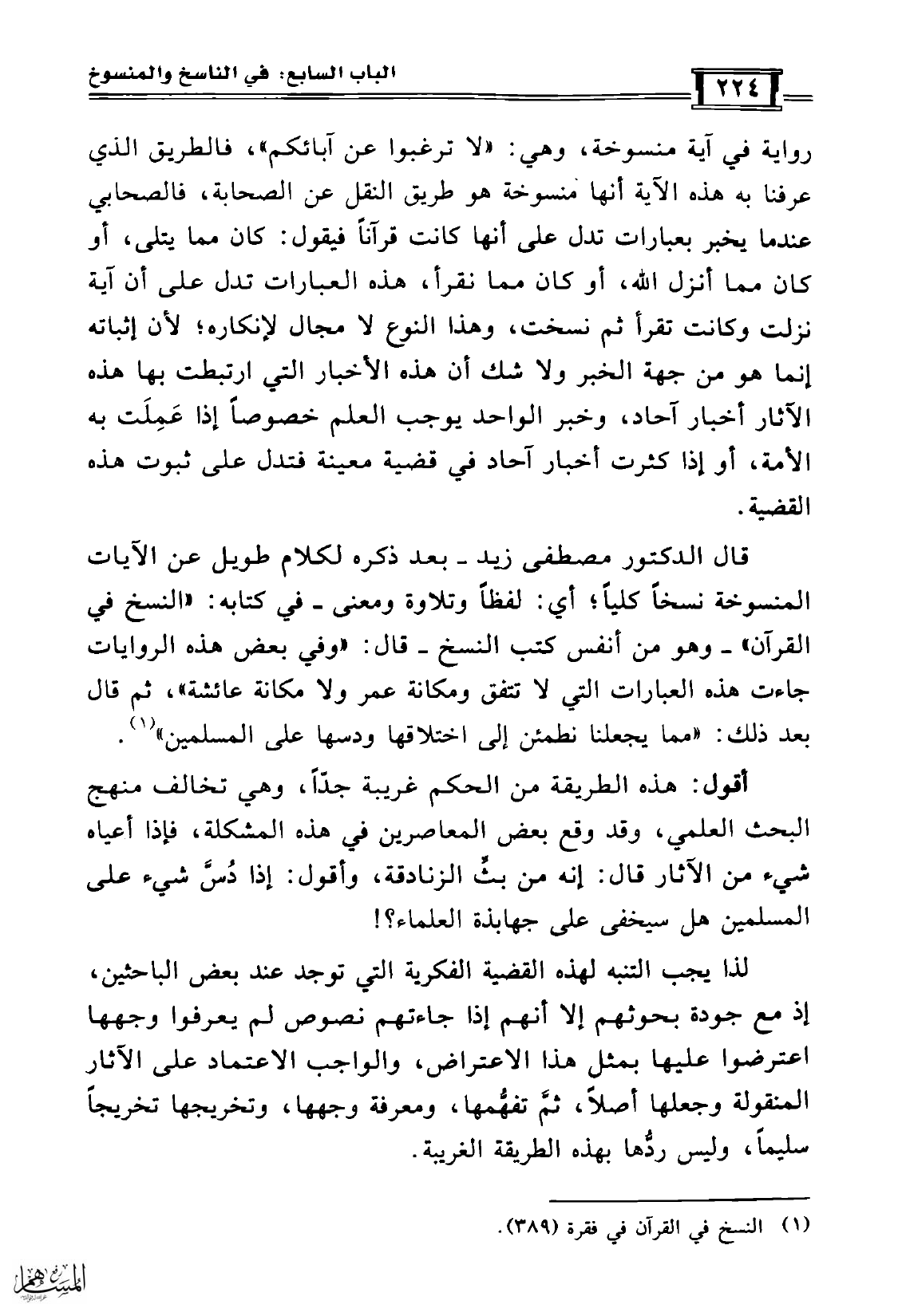 رواية في آية منسوخة، وهي: «لا ترغبوا عن آبائكم»، فالطريق الذي عرفنا به هذه الآية أنها منسوخة هو طريق النقل عن الصحابة، فالصحابي عندما يخبر بعبارات تدل على أنها كانت قرآناً فيقول: كان مما يتلى، أو كان مما أنزل الله، أو كان مما نقرأ، هذه العبارات تدل على أن آية نزلت وكانت تقرأ ثم نسخت، وهذا النوع لا مجال لإنكاره؛ لأن إثباته إنما هو من جهة الخبر ولا شك أن هذه الأخبار التي ارتبطت بها هذه الآثار أخبار آحاد، وخبر الواحد يوجب العلم خصوصاً إذا عَمِلَت به الأمة، أو إذا كثرت أخبار آحاد في قضية معينة فتدل على ثبوت هذه القضية.