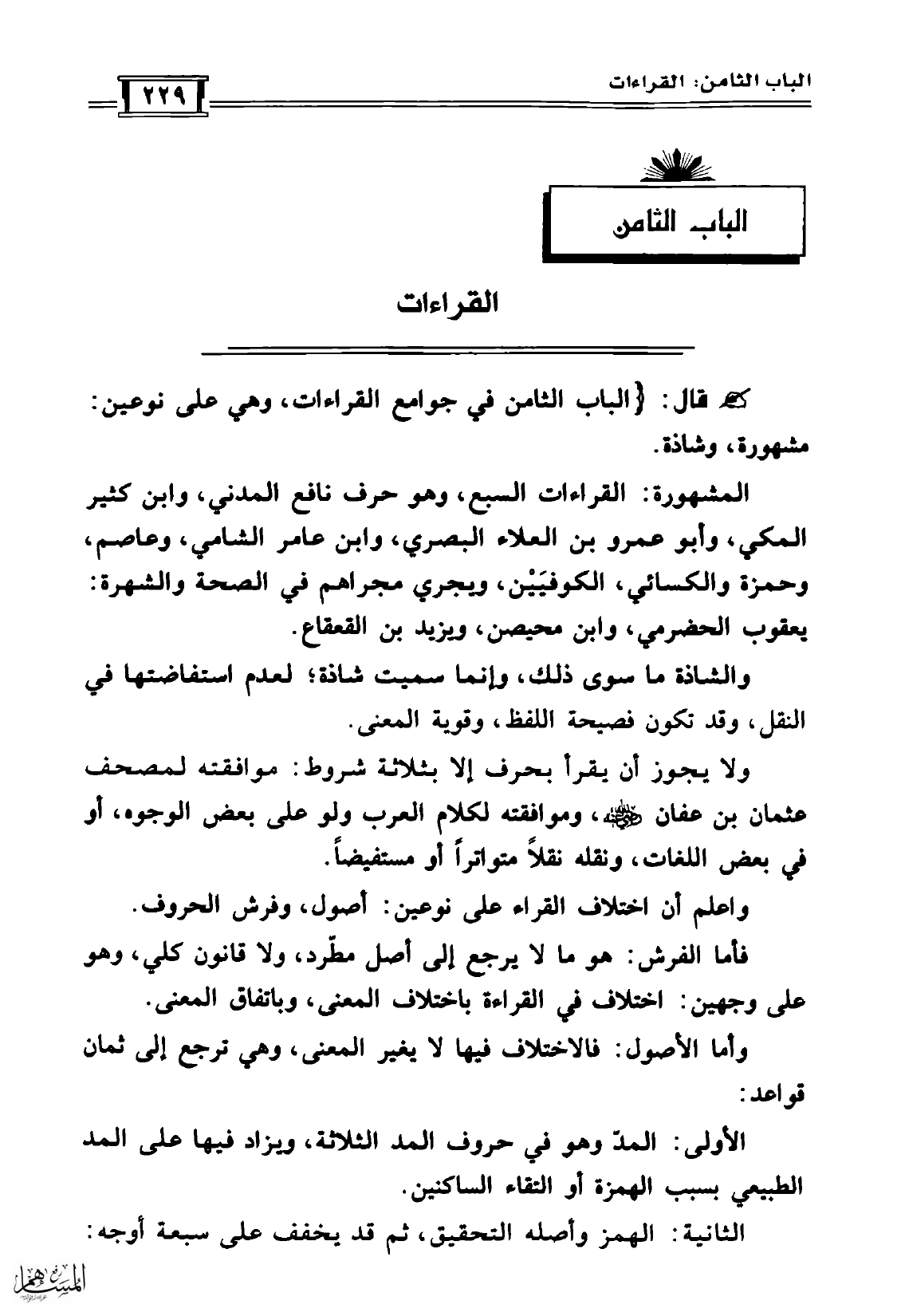 قال: الباب الثامن في جوامع القراءات، وهي على نوعين: مشهورة، وشاذة.