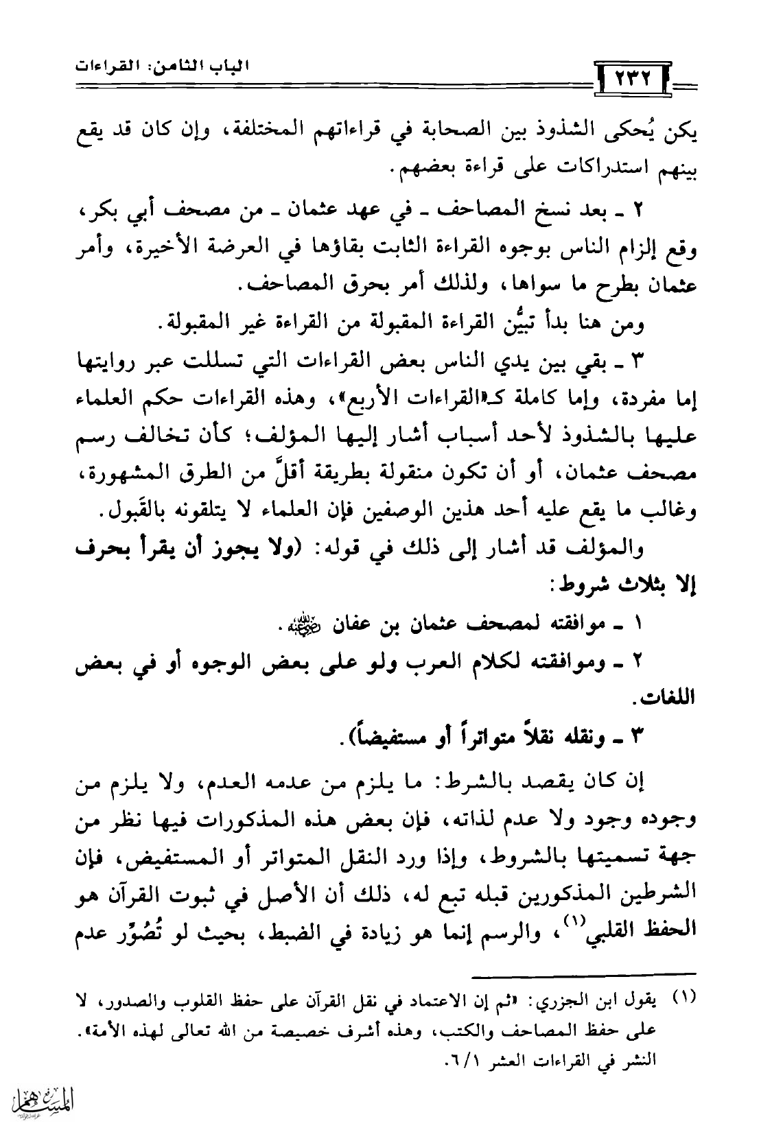 والمؤلف قد أشار إلى ذلك في قوله: (ولا يجوز أن يقرأ بحرف إلا بثلاث شروط: