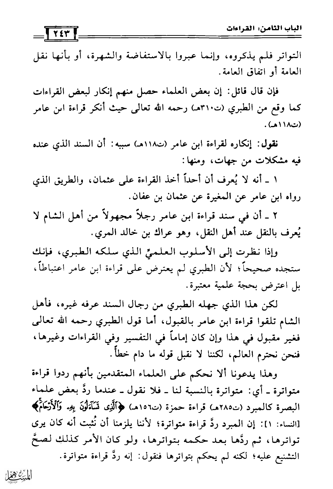 فإن قال قائل: إن بعض العلماء حصل منهم إنكار لبعض القراءات كما وقع من الطبري (ت310هـ) رحمه الله تعالى حيث أنكر قراءة ابن عامر (ت118هـ).