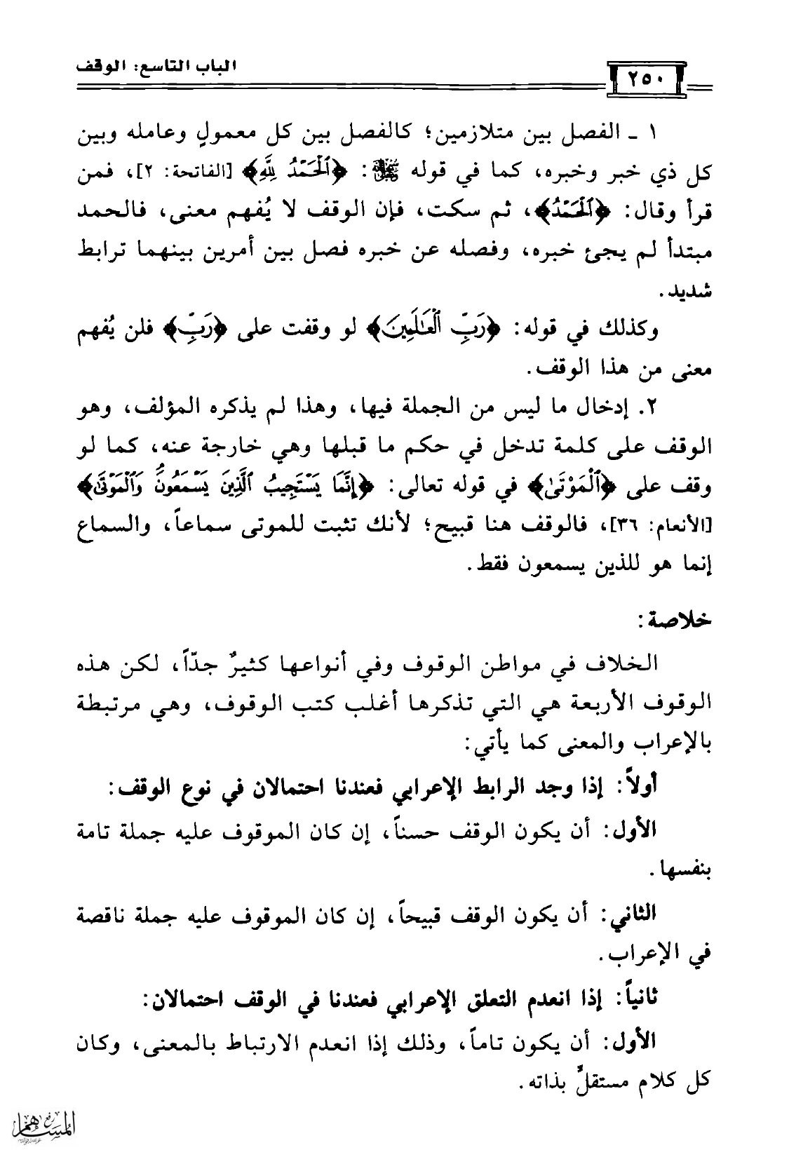 1 - الفصل بين متلازمين؛ كالفصل بين كل معمولٍ وعامله وبين كل ذي خبر وخبره، كما في قوله سبحانه وتعالى: {الْحَمْدُ لِلَّهِ} [الفاتحة: 2]، فمن قرأ وقال: {الْحَمْدُ}، ثم سكت، فإن الوقف لا يُفهم معنى، فالحمد مبتدأ لم يجئ خبره، وفصله عن خبره فصل بين أمرين بينهما ترابط شديد.