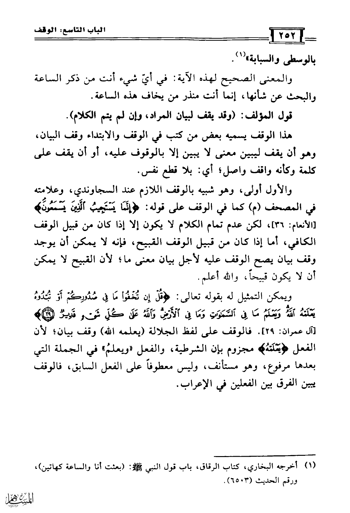والأول أولى، وهو شبيه بالوقف اللازم عند السجاوندي، وعلامته في المصحف (م) كما في الوقف على قوله: {إِنَّمَا يَسْتَجِيبُ الَّذِينَ يَسْمَعُونَ} [الأنعام: 36]، لكن عدم تمام الكلام لا يكون إلا إذا كان من قبيل الوقف الكافي، أما إذا كان من قبيل الوقف القبيح، فإنه لا يمكن أن يوجد وقف بيان يصح الوقف عليه لأجل بيان معنى ما؛ لأن القبيح لا يمكن أن لا يكون قبيحاً، والله أعلم.