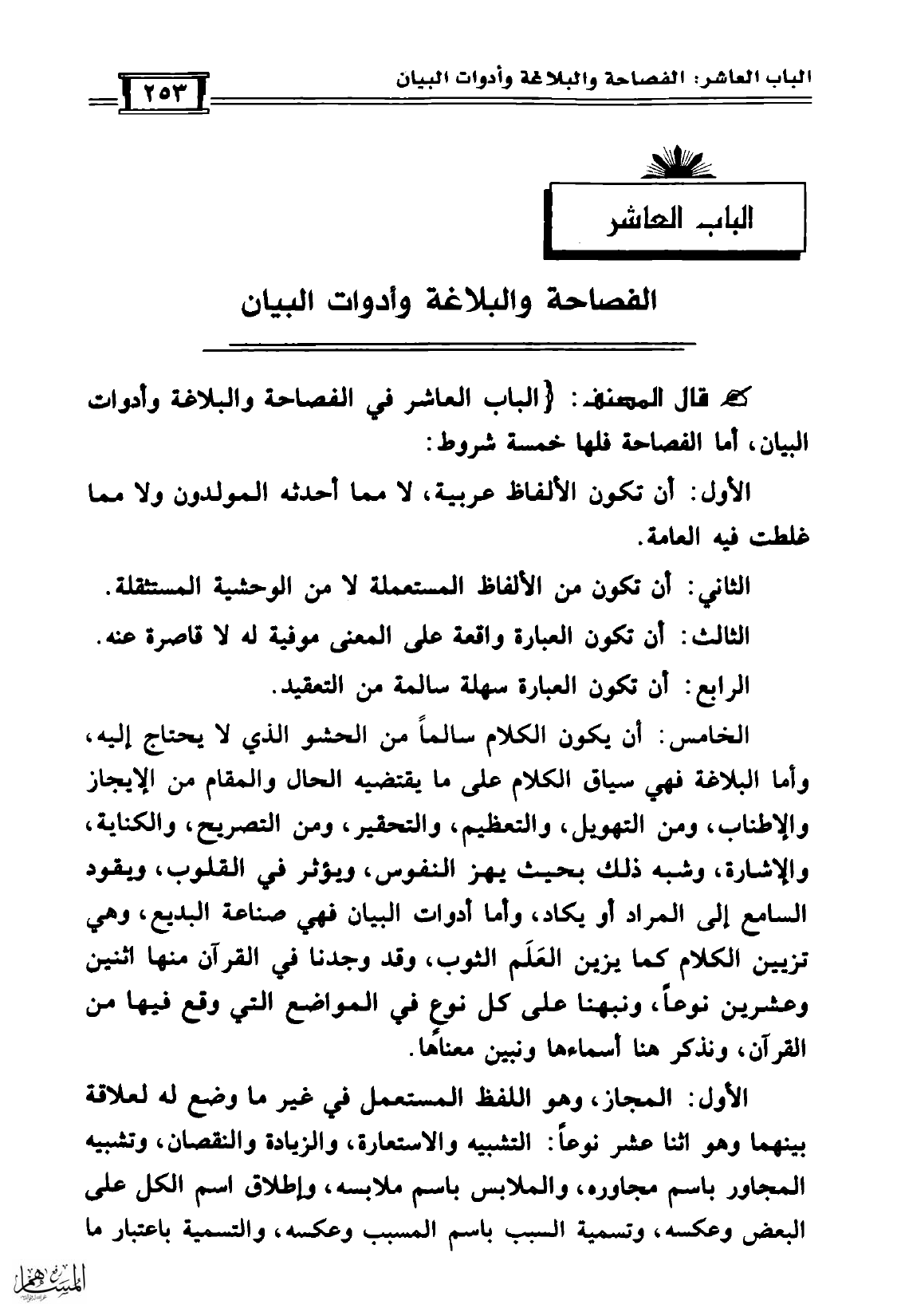 قال المصنف: الباب العاشر في الفصاحة والبلاغة وأدوات البيان، أما الفصاحة فلها خمسة شروط: