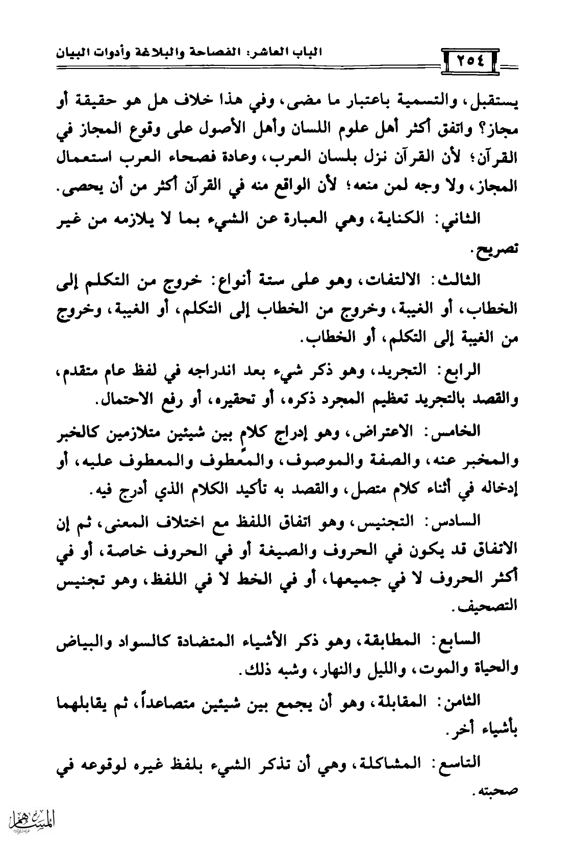 الخامس: الاعتراض، وهو إدراج كلامٍ بين شيئين متلازمين كالخبر والمخبر عنه، والصفة والموصوف، والمعطوف والمعطوف عليه، أو إدخاله في أثناء كلام متصل، والقصد به تأكيد الكلام الذي أدرج فيه.