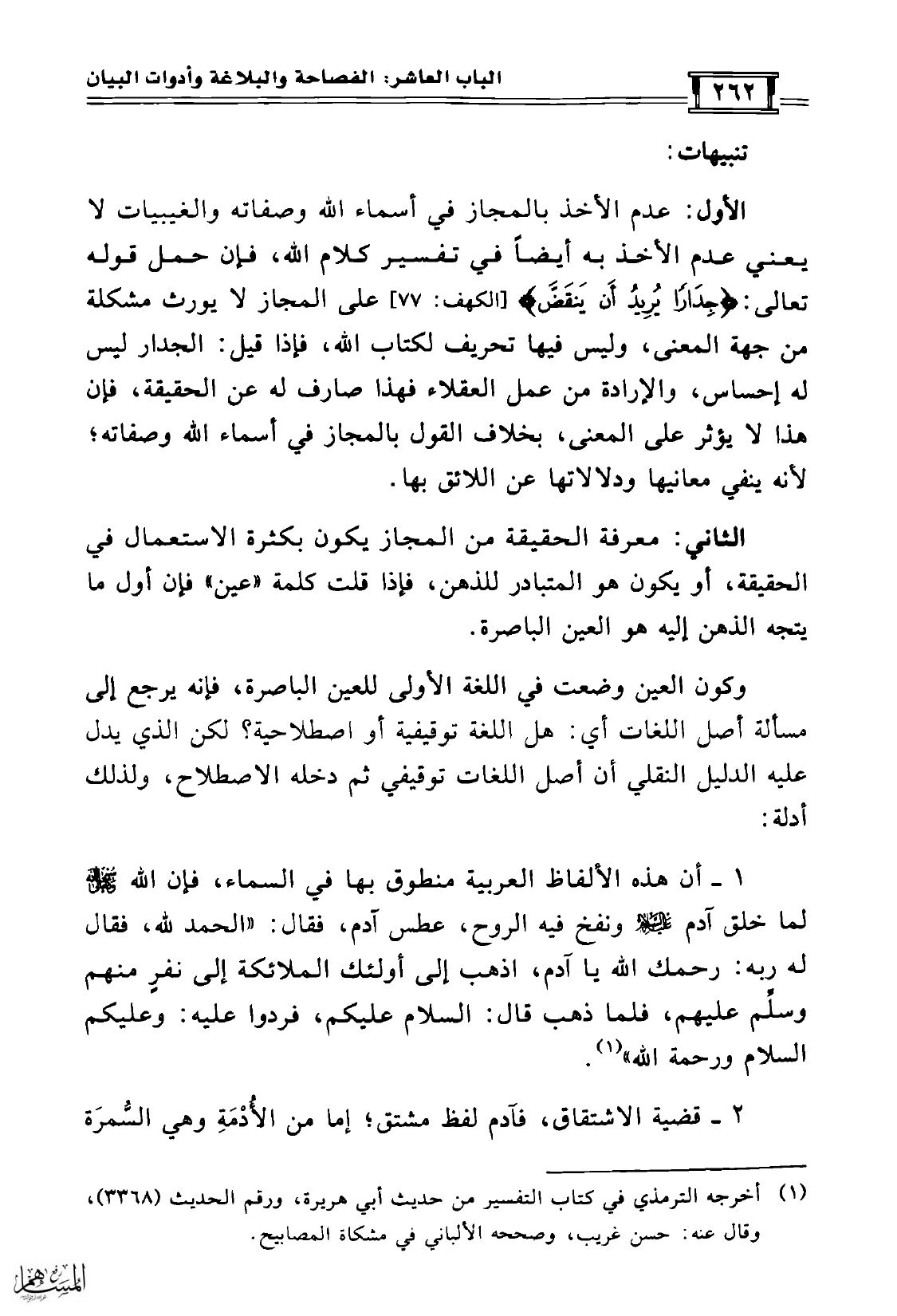 1 - أن هذه الألفاظ العربية منطوق بها في السماء، فإن الله سبحانه وتعالى لما خلق آدم عليه السلام ونفخ فيه الروح، عطس آدم، فقال: «الحمد لله، فقال له ربه: رحمك الله يا آدم، اذهب إلى أولئك الملائكة إلى نفرٍ منهم وسلِّم عليهم، فلما ذهب قال: السلام عليكم، فردوا عليه: وعليكم السلام ورحمة الله» (¬1).