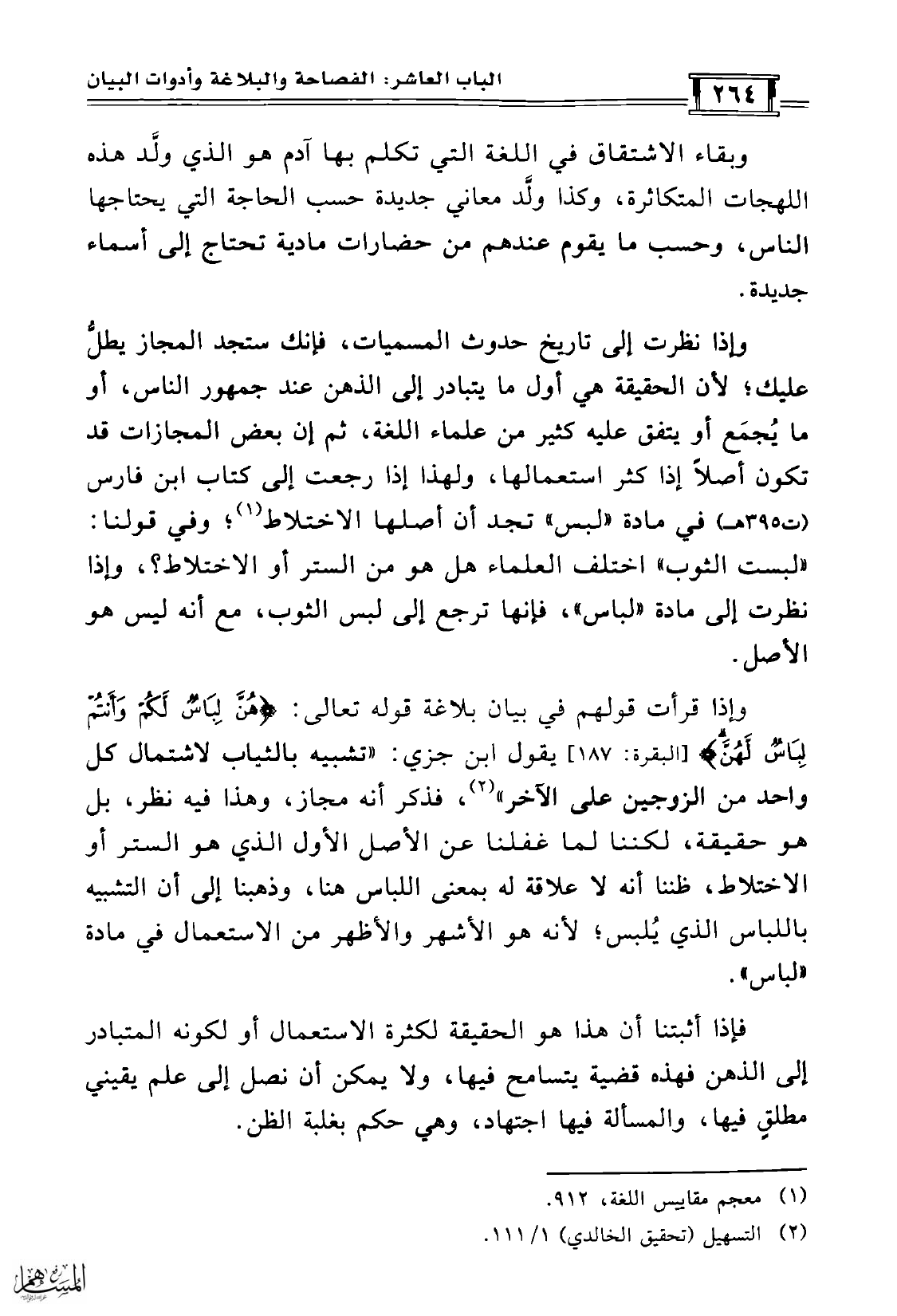 وإذا نظرت إلى تاريخ حدوث المسميات، فإنك ستجد المجاز يطلُّ عليك؛ لأن الحقيقة هي أول ما يتبادر إلى الذهن عند جمهور الناس، أو ما يُجمَع أو يتفق عليه كثير من علماء اللغة، ثم إن بعض المجازات قد تكون أصلاً إذا كثر استعمالها، ولهذا إذا رجعت إلى كتاب ابن فارس (ت395هـ) في مادة «لبس» تجد أن أصلها الاختلاط (¬1)؛ وفي قولنا: «لبست الثوب» اختلف العلماء هل هو من الستر أو الاختلاط؟، وإذا نظرت إلى مادة «لباس»، فإنها ترجع إلى لبس الثوب، مع أنه ليس هو الأصل.
