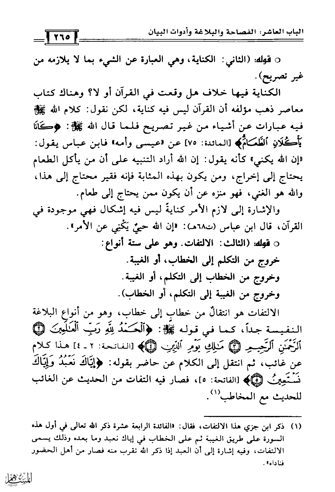 الكناية فيها خلاف هل وقعت في القرآن أو لا؟ وهناك كتاب معاصر ذهب مؤلفه أن القرآن ليس فيه كناية، لكن نقول: كلام الله سبحانه وتعالى فيه عبارات عن أشياء من غير تصريح فلما قال الله سبحانه وتعالى: {كَانَا يَاكُلاَنِ الطَّعَامَ} [المائدة: 75] عن «عيسى وأمه» فابن عباس يقول: «إن الله يكني» كأنه يقول: إن الله أراد التنبيه على أن من يأكل الطعام يحتاج إلى إخراج، ومن يكون بهذه المثابة فإنه فقير محتاج إلى هذا، والله هو الغني، فهو منزه عن أن يكون ممن يحتاج إلى طعام.