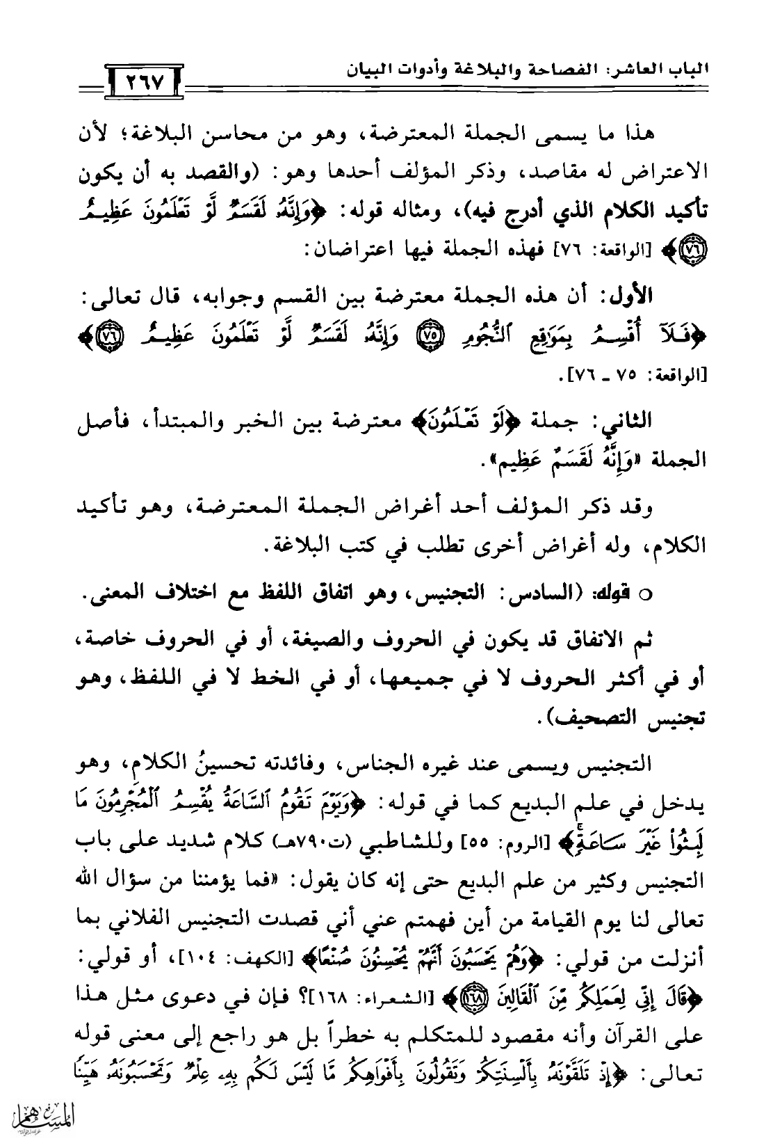 هذا ما يسمى الجملة المعترضة، وهو من محاسن البلاغة؛ لأن الاعتراض له مقاصد، وذكر المؤلف أحدها وهو: (والقصد به أن يكون تأكيد الكلام الذي أدرج فيه)، ومثاله قوله: {وَإِنَّهُ لَقَسَمٌ لَوْ تَعْلَمُونَ عَظِيمٌ} [الواقعة: 76] فهذه الجملة فيها اعتراضان: