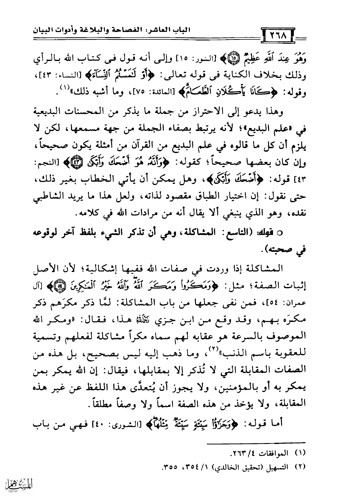 وهذا يدعو إلى الاحتراز من جملة ما يذكر من المحسنات البديعية في «علم البديع»؛ لأنه يرتبط بصفاء الجملة من جهة مسمعها، لكن لا يلزم أن كل ما قالوه في علم البديع من القرآن من أمثلة يكون صحيحاً، وإن كان بعضها صحيحاً؛ كقوله: {وَأَنَّهُ هُوَ أَضْحَكَ وَأَبْكَى} [النجم: 43] قوله: {أَضْحَكَ وَأَبْكَى}، وهل يمكن أن يأتي الخطاب بغير ذلك، حتى نقول: إن اختيار الطباق مقصود لذاته، ولعل هذا ما يريد الشاطبي نقده، وهو الذي ينبغي ألا يقال أنه من مرادات الله في كلامه.