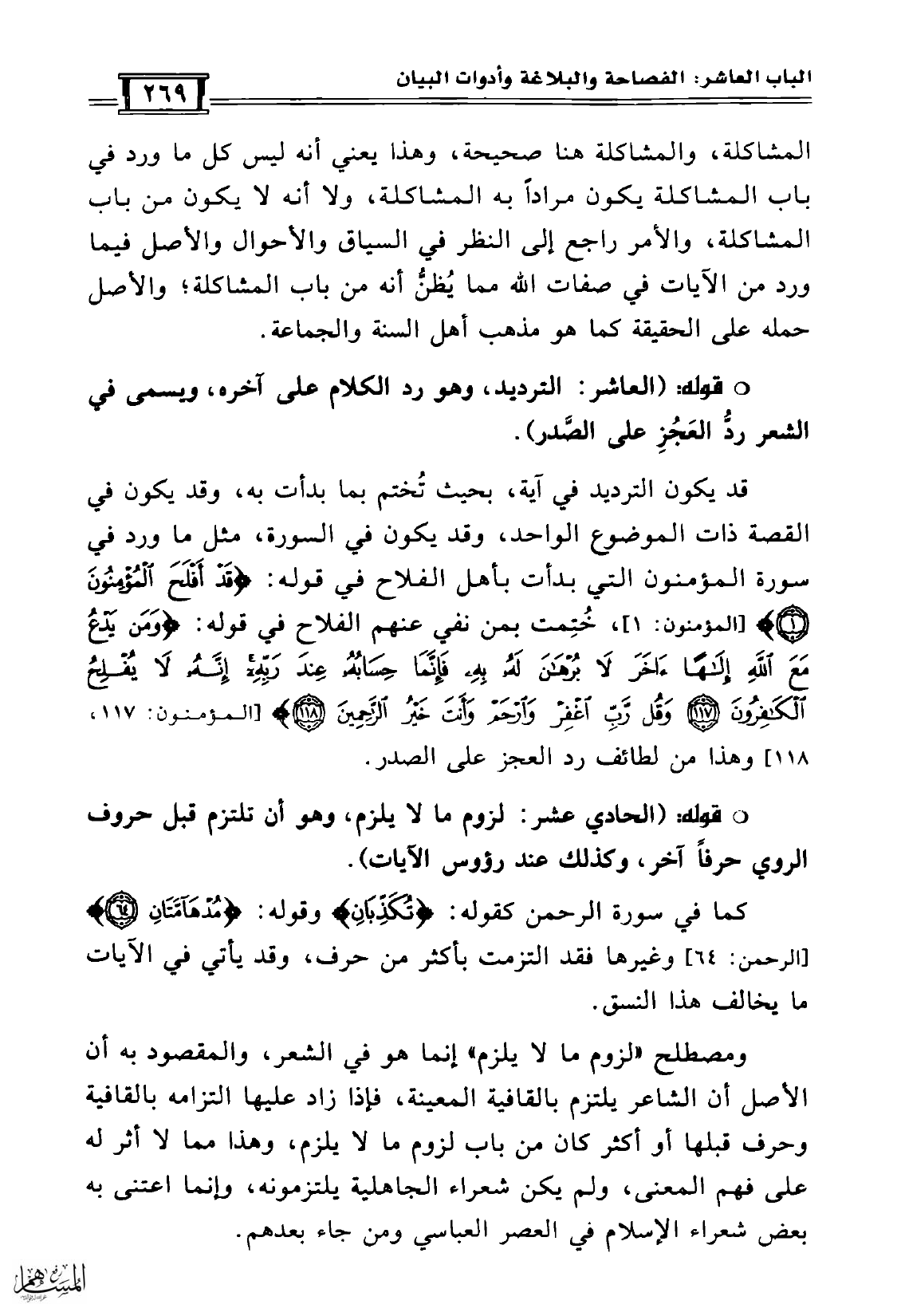 قوله: (العاشر: الترديد، وهو رد الكلام على آخره، ويسمى في الشعر ردُّ العَجُزِ على الصَّدر).