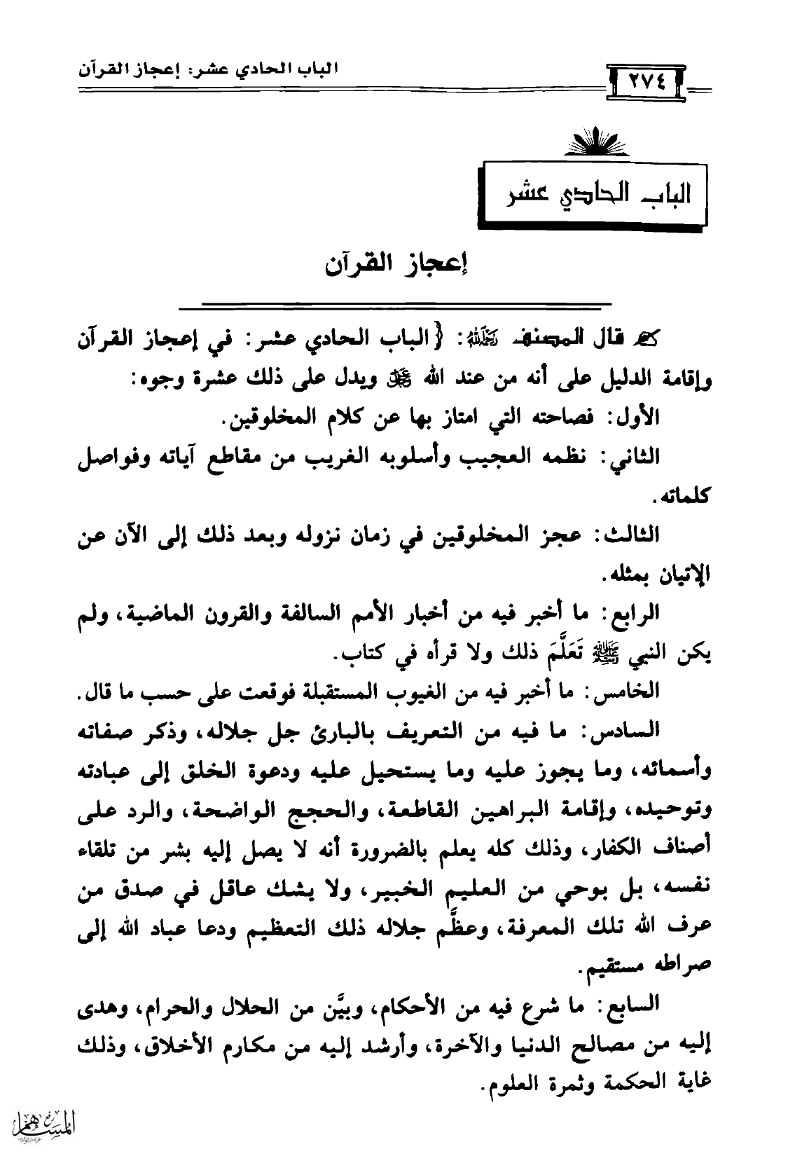 قال المصنف رحمه الله: الباب الحادي عشر: في إعجاز القرآن وإقامة الدليل على أنه من عند الله عزّ وجل ويدل على ذلك عشرة وجوه: