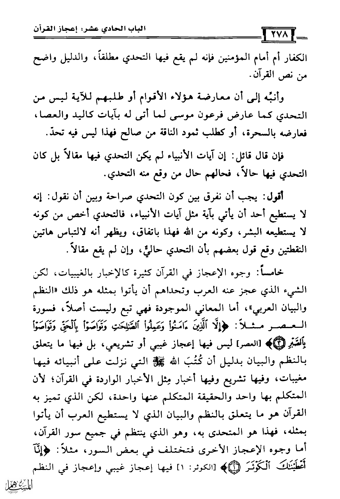 خامساً: وجوه الإعجاز في القرآن كثيرة كالإخبار بالغيبيات، لكن الشيء الذي عجز عنه العرب وتحداهم أن يأتوا بمثله هو ذلك «النظم والبيان العربي»، أما المعاني الموجودة فهي تبع وليست أصلاً، فسورة العصر مثلاً: {إِلاَّ الَّذِينَ آمَنُوا وَعَمِلُوا الصَّالِحَاتِ وَتَوَاصَوْا بِالْحَقِّ وَتَوَاصَوْا بِالصَّبْرِ} [العصر] ليس فيها إعجاز غيبي أو تشريعي، بل فيها ما يتعلق بالنظم والبيان بدليل أن كُتُبَ الله سبحانه وتعالى التي نزلت على أنبيائه فيها مغيبات، وفيها تشريع وفيها أخبار مِثل الأخبار الواردة في القرآن؛ لأن المتكلم بها واحد والحقيقة المتكلم عنها واحدة، لكن الذي تميز به القرآن هو ما يتعلق بالنظم والبيان الذي لا يستطيع العرب أن يأتوا بمثله، فهذا هو المتحدى به، وهو الذي ينتظم في جميع سور القرآن، أما وجوه الإعجاز الأخرى فتختلف في بعض السور، مثلاً: {إِنَّا أَعْطَيْنَاكَ الْكَوْثَرَ} [الكوثر: 1] فيها إعجاز غيبي وإعجاز في النظم