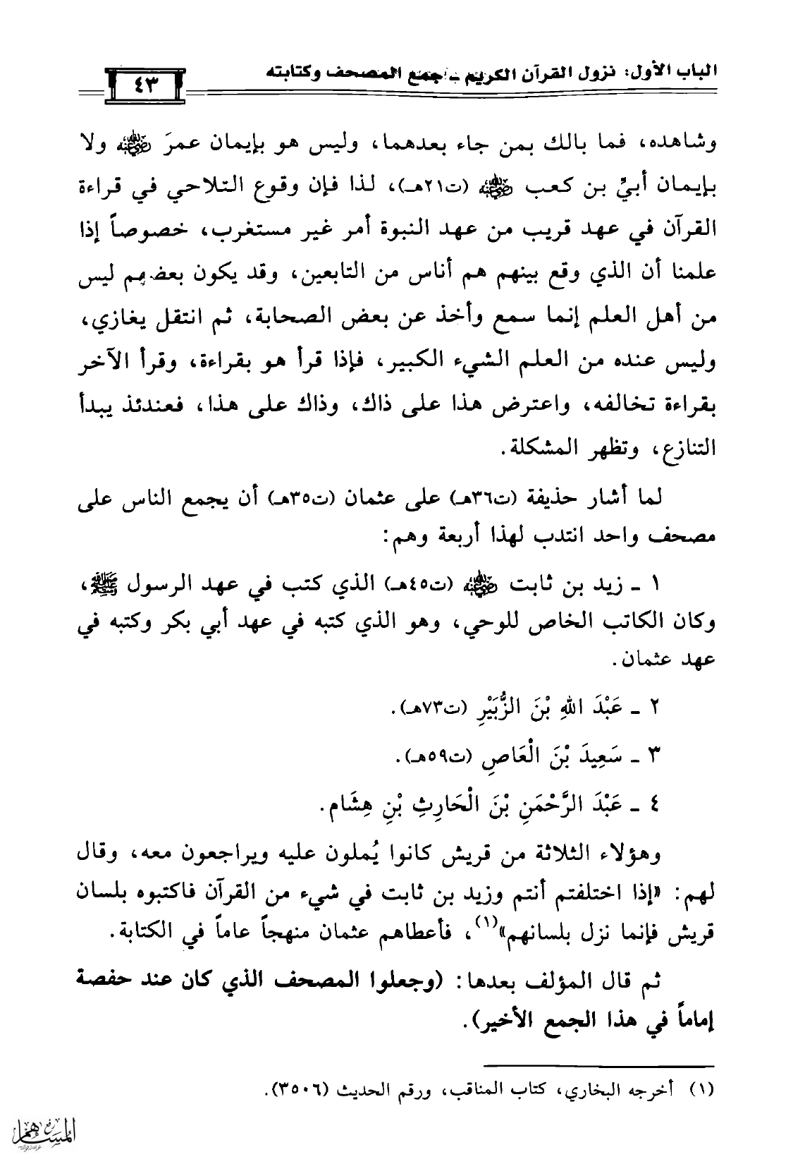 لما أشار حذيفة (ت36هـ) على عثمان (ت35هـ) أن يجمع الناس على مصحف واحد انتدب لهذا أربعة وهم: