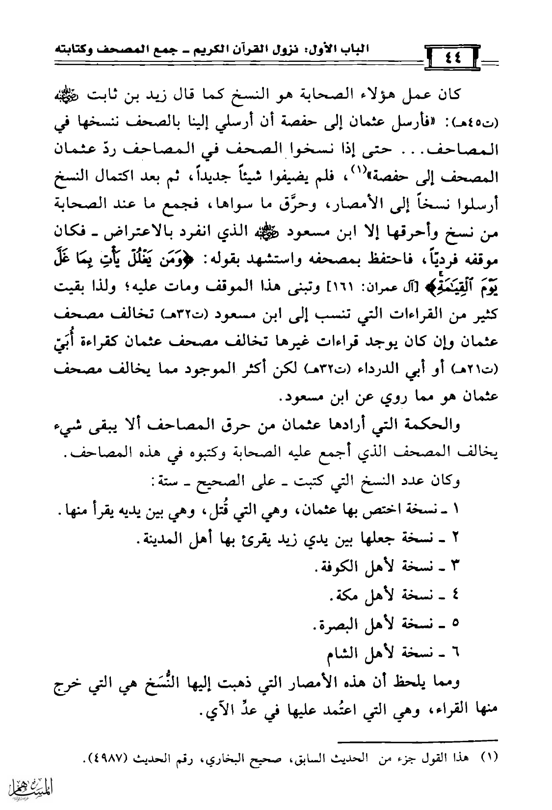 كان عمل هؤلاء الصحابة هو النسخ كما قال زيد بن ثابت رضي الله عنه (ت45هـ): «فأرسل عثمان إلى حفصة أن أرسلي إلينا بالصحف ننسخها في المصاحف ... حتى إذا نسخوا الصحف في المصاحف ردّ عثمان المصحف إلى حفصة» (¬1)، فلم يضيفوا شيئاً جديداً، ثم بعد اكتمال النسخ أرسلوا نسخاً إلى الأمصار، وحرَّق ما سواها، فجمع ما عند الصحابة من نسخ وأحرقها إلا ابن مسعود رضي الله عنه الذي انفرد بالاعتراض ـ فكان موقفه فرديّاً، فاحتفظ بمصحفه واستشهد بقوله: {وَمَنْ يَغْلُلْ يَاتِ بِمَا غَلَّ يَوْمَ الْقِيَامَةِ} [آل عمران: 161] وتبنى هذا الموقف ومات عليه؛ ولذا بقيت كثير من القراءات التي تنسب إلى ابن مسعود (ت32هـ) تخالف مصحف عثمان وإن كان يوجد قراءات غيرها تخالف مصحف عثمان كقراءة أُبَيّ (ت21هـ) أو أبي الدرداء (ت32هـ) لكن أكثر الموجود مما يخالف مصحف عثمان هو مما روي عن ابن مسعود.