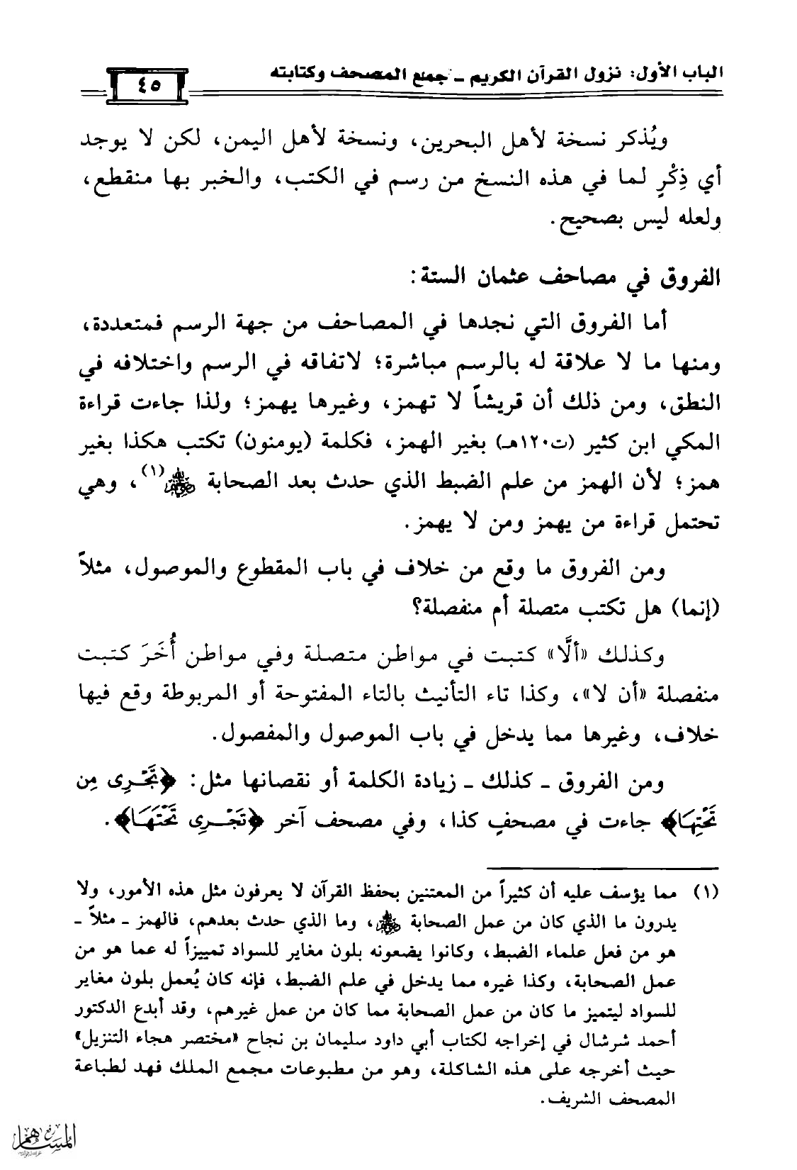 (¬1) مما يؤسف عليه أن كثيراً من المعتنين بحفظ القرآن لا يعرفون مثل هذه الأمور، ولا يدرون ما الذي كان من عمل الصحابة رضي الله عنهم، وما الذي حدث بعدهم، فالهمز ـ مثلاً ـ هو من فعل علماء الضبط، وكانوا يضعونه بلون مغاير للسواد تمييزاً له عما هو من عمل الصحابة، وكذا غيره مما يدخل في علم الضبط، فإنه كان يُعمل بلون مغاير للسواد ليتميز ما كان من عمل الصحابة مما كان من عمل غيرهم، وقد أبدع الدكتور أحمد شرشال في إخراجه لكتاب أبي داود سليمان بن نجاح «مختصر هجاء التنزيل» حيث أخرجه على هذه الشاكلة، وهو من مطبوعات مجمع الملك فهد لطباعة المصحف الشريف.