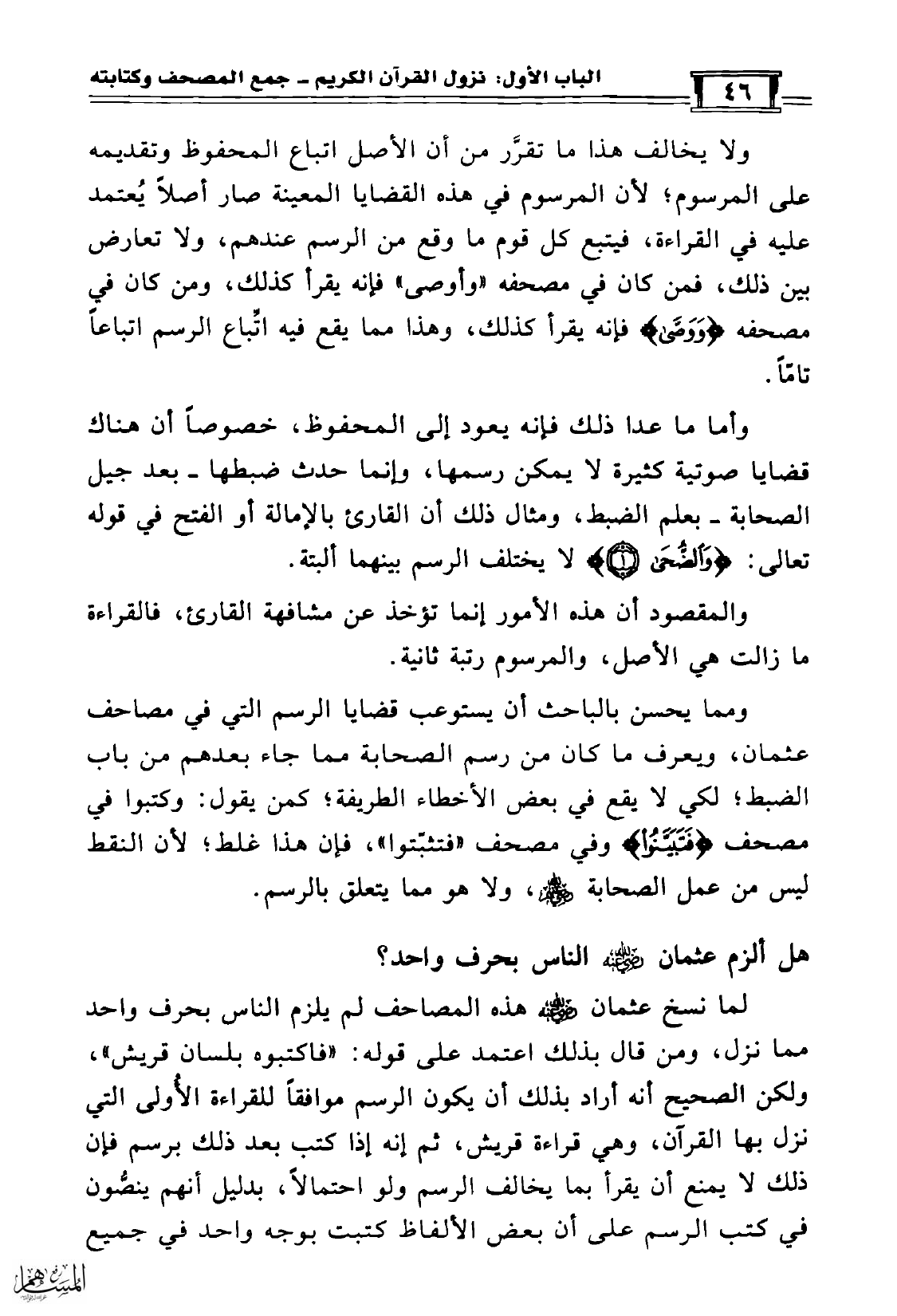 وأما ما عدا ذلك فإنه يعود إلى المحفوظ، خصوصاً أن هناك قضايا صوتية كثيرة لا يمكن رسمها، وإنما حدث ضبطها ـ بعد جيل الصحابة ـ بعلم الضبط، ومثال ذلك أن القارئ بالإمالة أو الفتح في قوله تعالى: {وَالضُّحَى} لا يختلف الرسم بينهما ألبتة.