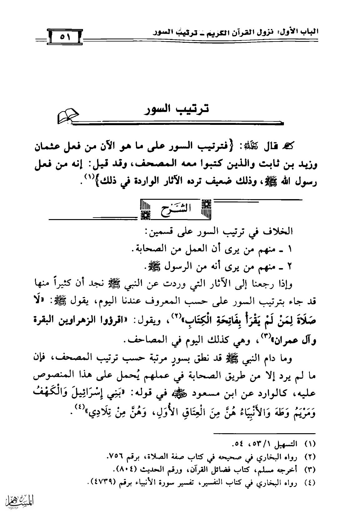 وما دام النبي صلّى الله عليه وسلّم قد نطق بسورٍ مرتبة حسب ترتيب المصحف، فإن ما لم يرد إلا من طريق الصحابة في عملهم يُحمل على هذا المنصوص عليه، كالوارد عن ابن مسعود رضي الله عنه في قوله: «بَنِي إِسْرَائِيلَ وَالْكَهْفُ وَمَرْيَمُ وَطَهَ وَالأَنْبِيَاءُ هُنَّ مِنَ الْعِتَاقِ الأُوَلِ، وَهُنَّ مِنْ تِلاَدِي» (¬4).