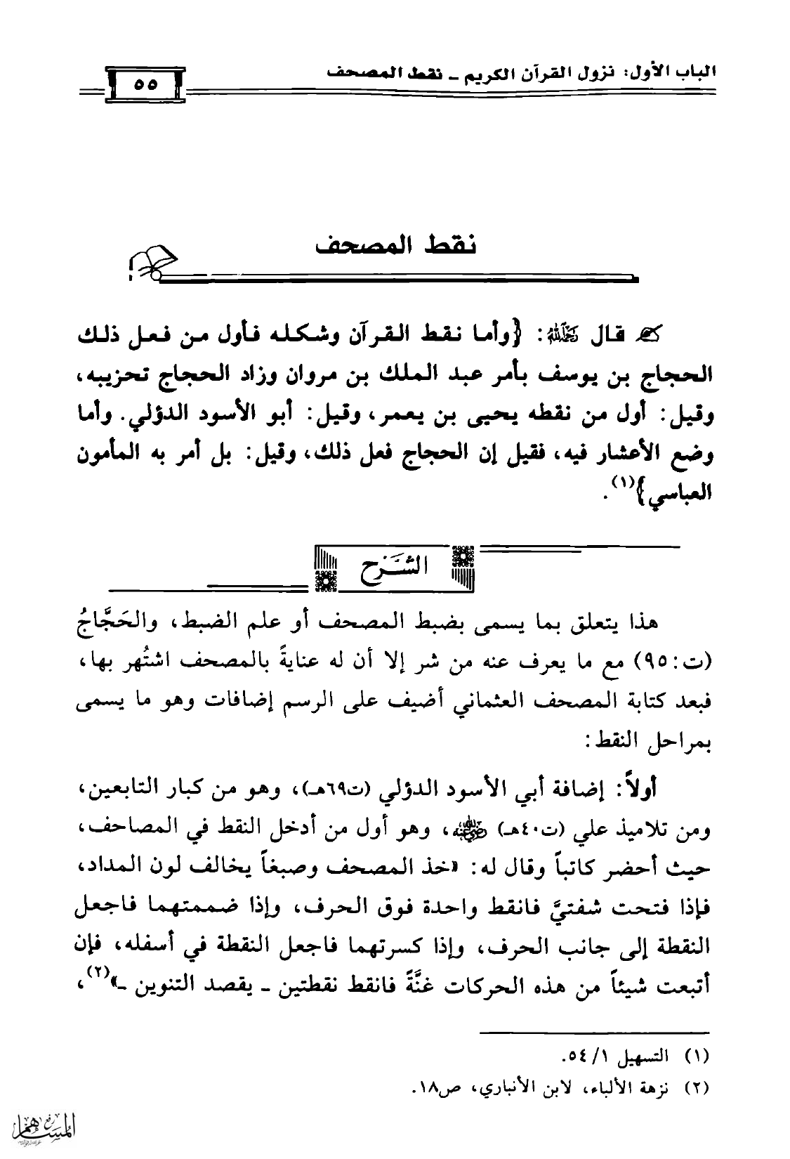 قال رحمه الله: وأما نقط القرآن وشكله فأول من فعل ذلك الحجاج بن يوسف بأمر عبد الملك بن مروان وزاد الحجاج تحزيبه، وقيل: أول من نقطه يحيى بن يعمر، وقيل: أبو الأسود الدؤلي. وأما وضع الأعشار فيه، فقيل إن الحجاج فعل ذلك، وقيل: بل أمر به المأمون العباسي (¬1).