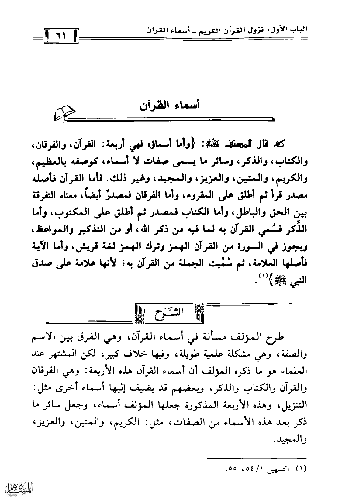 طرح المؤلف مسألة في أسماء القرآن، وهي الفرق بين الاسم والصفة، وهي مشكلة علمية طويلة، وفيها خلاف كبير، لكن المشتهر عند العلماء هو ما ذكره المؤلف أن أسماء القرآن هذه الأربعة: وهي الفرقان والقرآن والكتاب والذكر، وبعضهم قد يضيف إليها أسماء أخرى مثل: التنزيل، وهذه الأربعة المذكورة جعلها المؤلف أسماء، وجعل سائر ما ذكر بعد هذه الأسماء من الصفات، مثل: الكريم، والمتين، والعزيز، والمجيد.