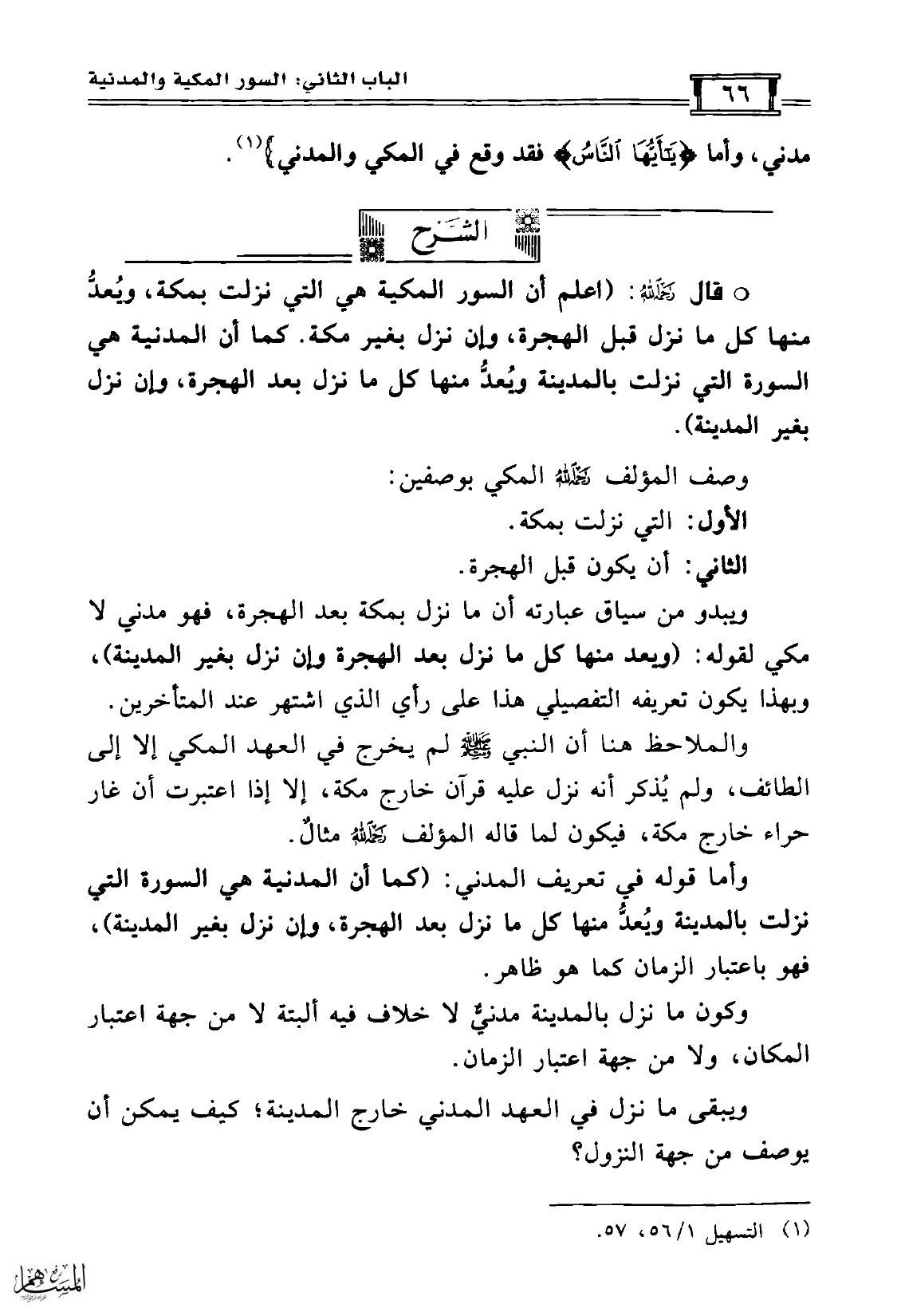 قال رحمه الله: (اعلم أن السور المكية هي التي نزلت بمكة، ويُعدُّ منها كل ما نزل قبل الهجرة، وإن نزل بغير مكة. كما أن المدنية هي السورة التي نزلت بالمدينة ويُعدُّ منها كل ما نزل بعد الهجرة، وإن نزل بغير المدينة).