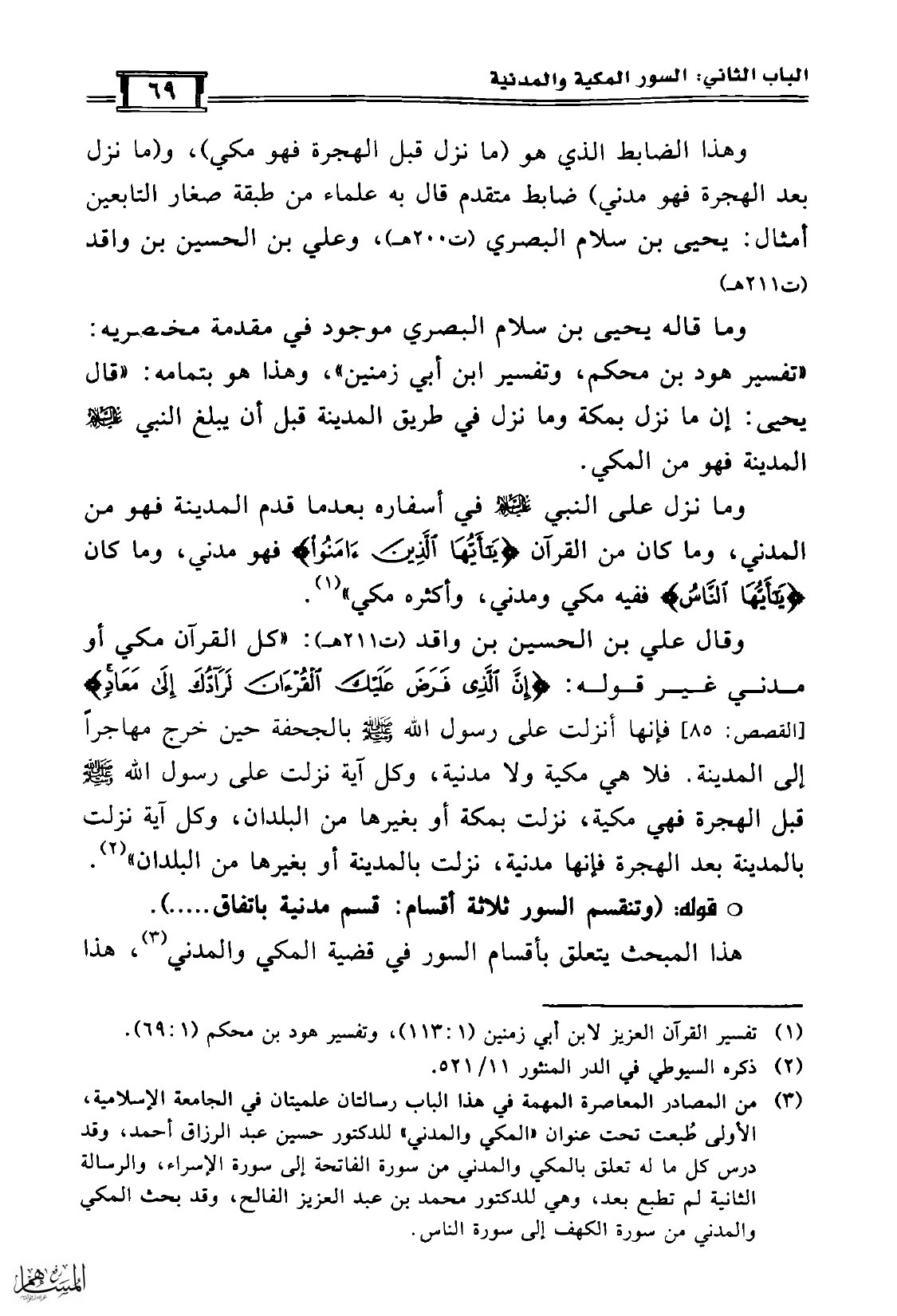 وما قاله يحيى بن سلام البصري موجود في مقدمة مختصريه: «تفسير هود بن محكم، وتفسير ابن أبي زمنين»، وهذا هو بتمامه: «قال يحيى: إن ما نزل بمكة وما نزل في طريق المدينة قبل أن يبلغ النبي عليه السلام المدينة فهو من المكي.