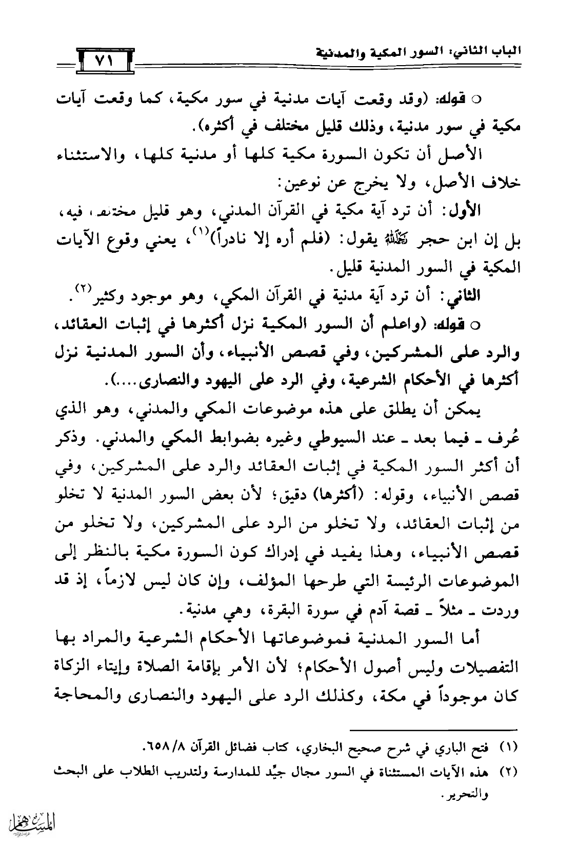 قوله: (وقد وقعت آيات مدنية في سور مكية، كما وقعت آيات مكية في سور مدنية، وذلك قليل مختلف في أكثره).