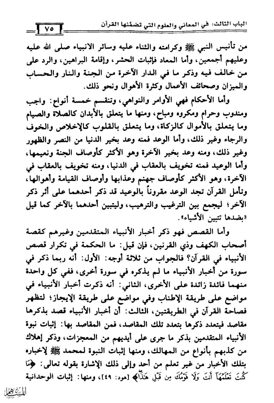وأما القصص فهو ذكر أخبار الأنبياء المتقدمين وغيرهم كقصة أصحاب الكهف وذي القرنين، فإن قيل: ما الحكمة في تكرار قصص الأنبياء في القرآن؟ فالجواب من ثلاثة أوجه: الأول: أنه ربما ذكر في سورة من أخبار الأنبياء ما لم يذكره في سورة أخرى، ففي كل واحدة منهما فائدة زائدة على الأخرى، الثاني: أنه ذكرت أخبار الأنبياء في مواضع على طريقة الإطناب وفي مواضع على طريقة الإيجاز؛ لتظهر فصاحة القرآن في الطريقتين، الثالث: أن أخبار الأنبياء قصد بذكرها مقاصد فيتعدد ذكرها بتعدد تلك المقاصد، فمن المقاصد بها: إثبات نبوة الأنبياء المتقدمين بذكر ما جرى على أيديهم من المعجزات، وذكر إهلاك من كذبهم بأنواع من المهالك، ومنها إثبات النبوة لمحمد صلّى الله عليه وسلّم لإخباره بتلك الأخبار من غير تعلم من أحد وإلى ذلك الإشارة بقوله تعالى: {مَا كُنْتَ تَعْلَمُهَا أَنْتَ وَلاَ قَوْمُكَ مِنْ قَبْلِ هَذَا} [هود: 49]، ومنها: إثبات الوحدانية