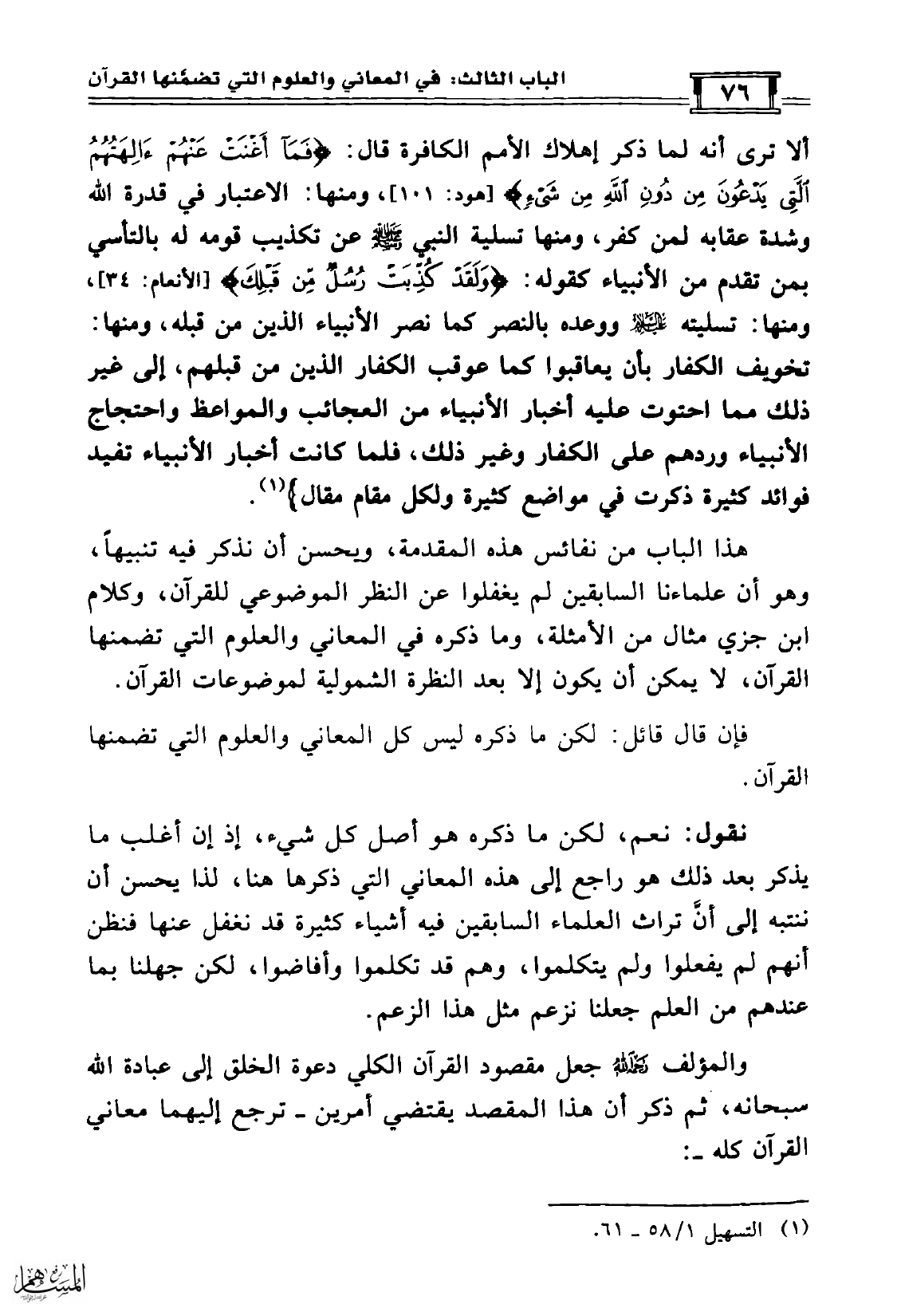 هذا الباب من نفائس هذه المقدمة، ويحسن أن نذكر فيه تنبيهاً، وهو أن علماءنا السابقين لم يغفلوا عن النظر الموضوعي للقرآن، وكلام ابن جزي مثال من الأمثلة، وما ذكره في المعاني والعلوم التي تضمنها القرآن، لا يمكن أن يكون إلا بعد النظرة الشمولية لموضوعات القرآن.