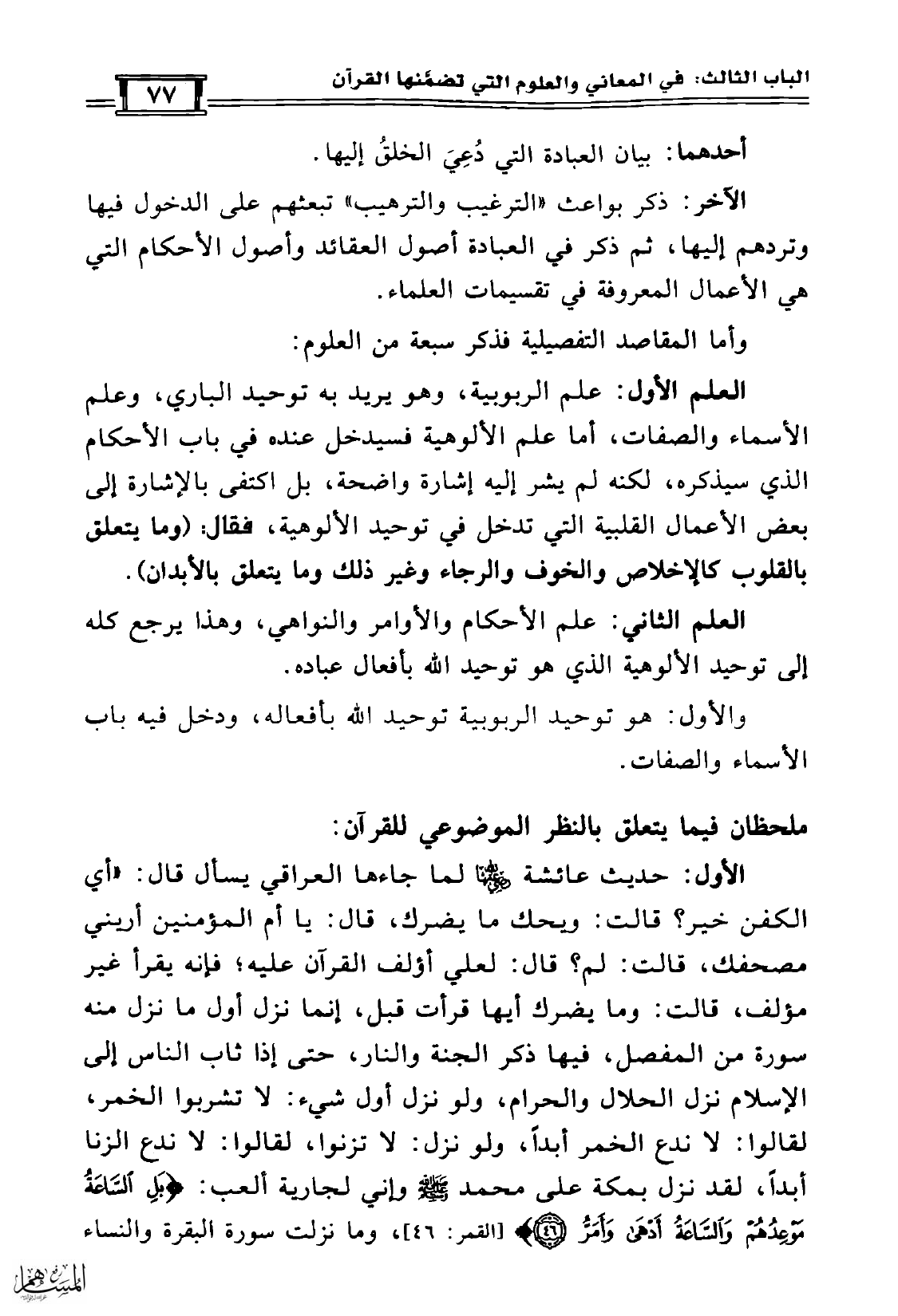 الآخر: ذكر بواعث «الترغيب والترهيب» تبعثهم على الدخول فيها وتردهم إليها، ثم ذكر في العبادة أصول العقائد وأصول الأحكام التي هي الأعمال المعروفة في تقسيمات العلماء.
