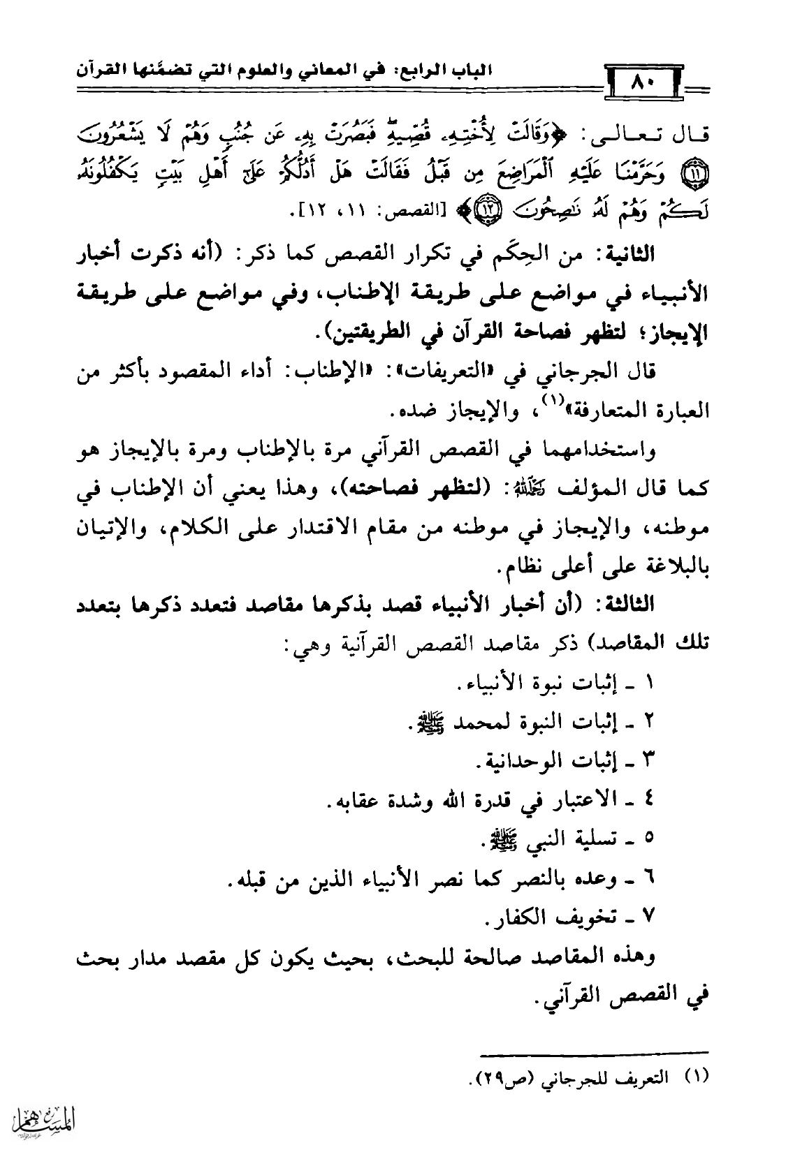 الثانية: من الحِكَم في تكرار القصص كما ذكر: (أنه ذكرت أخبار الأنبياء في مواضع على طريقة الإطناب، وفي مواضع على طريقة الإيجاز؛ لتظهر فصاحة القرآن في الطريقتين).